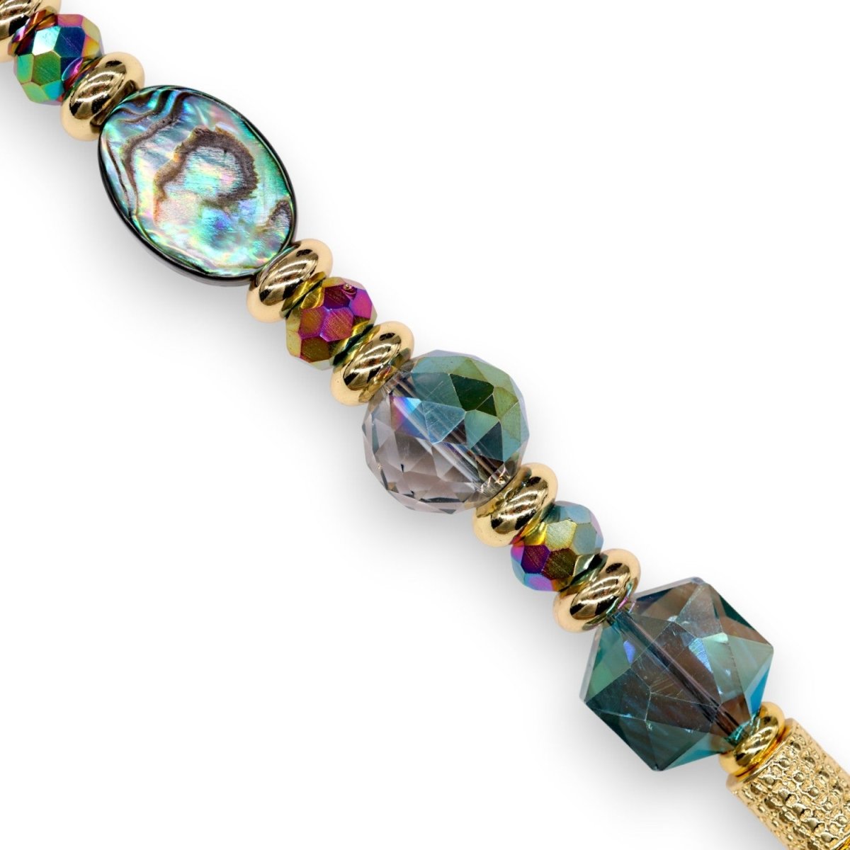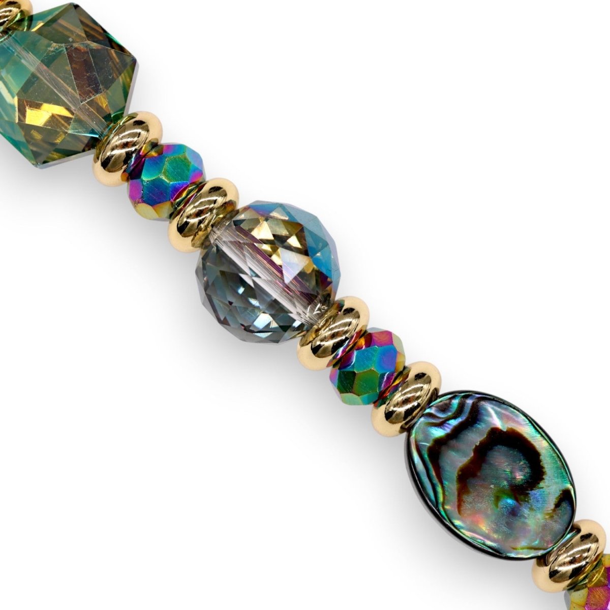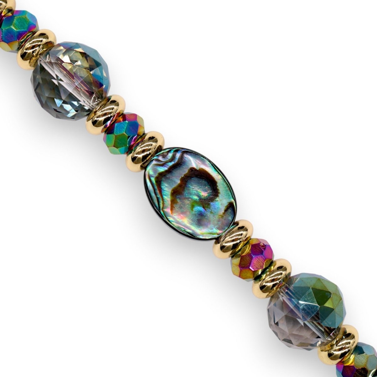 At its heart is an exquisite genuine abalone shell center bead, radiating iridescent hues of blue, violet, and green -symbolizing emotional balance, calm, and protection. Surrounding it are electroplated rainbow crystal glass beads, each one reflecting the glow and shifting colors of the aurora borealis. Every detail shimmers with wonder, light, and hope.