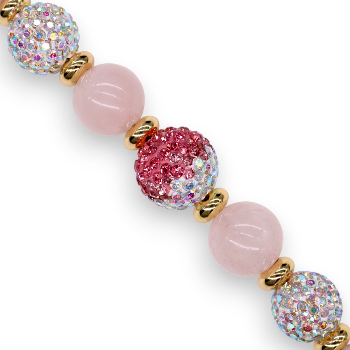 Genuine rose quartz gemstone beads and iridescent Austrian crystals add soft warmth and feminine glow, while 18KT gold-plated spacers and end beads bring a touch of refined luxury to this serene, elegant winter design.
