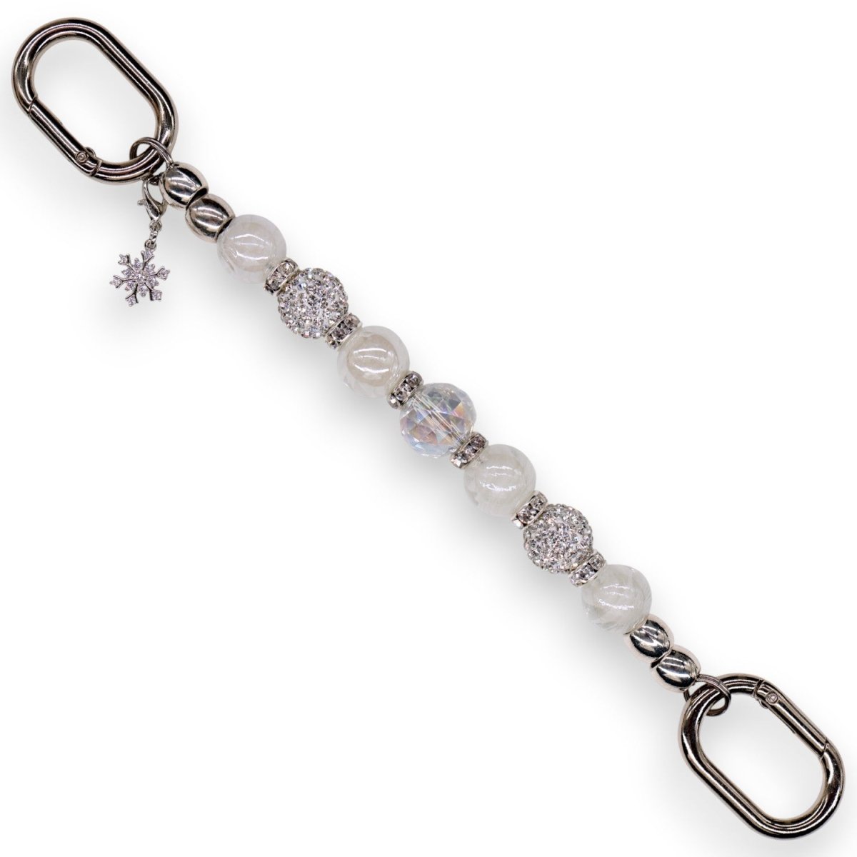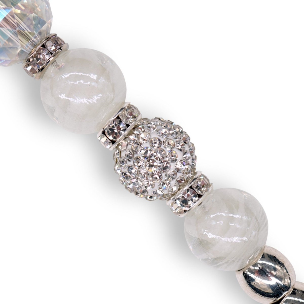At its heart rests an oversized electroplated faceted crystal glass bead, shimmering with icy radiance and framed by white rhinestone spacer beads that glisten like sunlight on untouched snow. White Austrian crystal beads add luminous sparkle, while a platinum-plated snowflake charm completes the design - a graceful symbol of purity and peace.