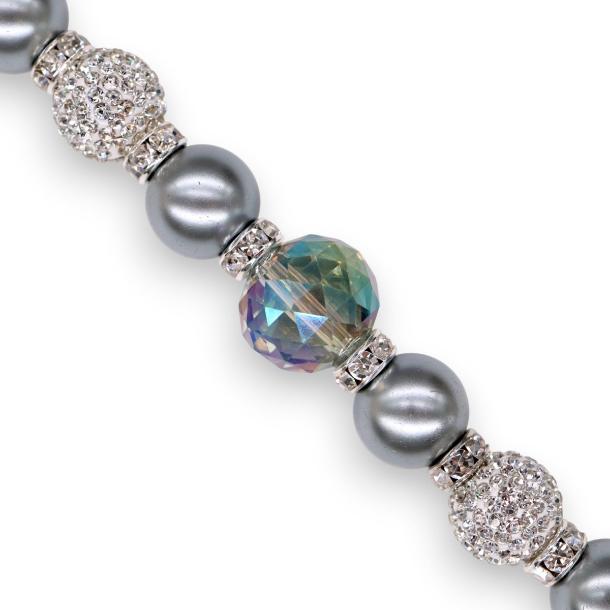Inspired by a snow-dusted winter morning, this design blends luminous silver tones and radiant crystal details for a look that feels both festive and refined. Silver glass pearl beads, white rhinestone spacers, and Austrian crystals surround the centerpiece, capturing the sparkle and spirit of the season.