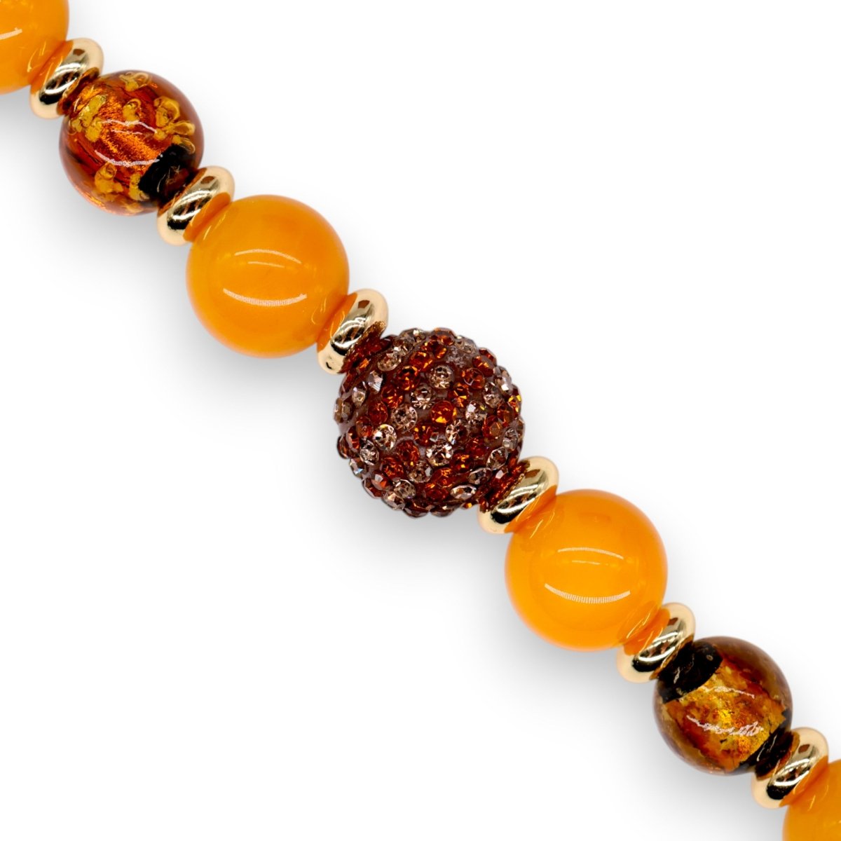 Pumpkin Spice is an exquisite blend of warmth and craftsmanship. Designed with 18K gold-plated accents, glowing orange agate gemstone beads, and black-and-orange gold-foil lampwork beads, this piece captures the cozy charm of autumn—luxurious, luminous, and unforgettable.