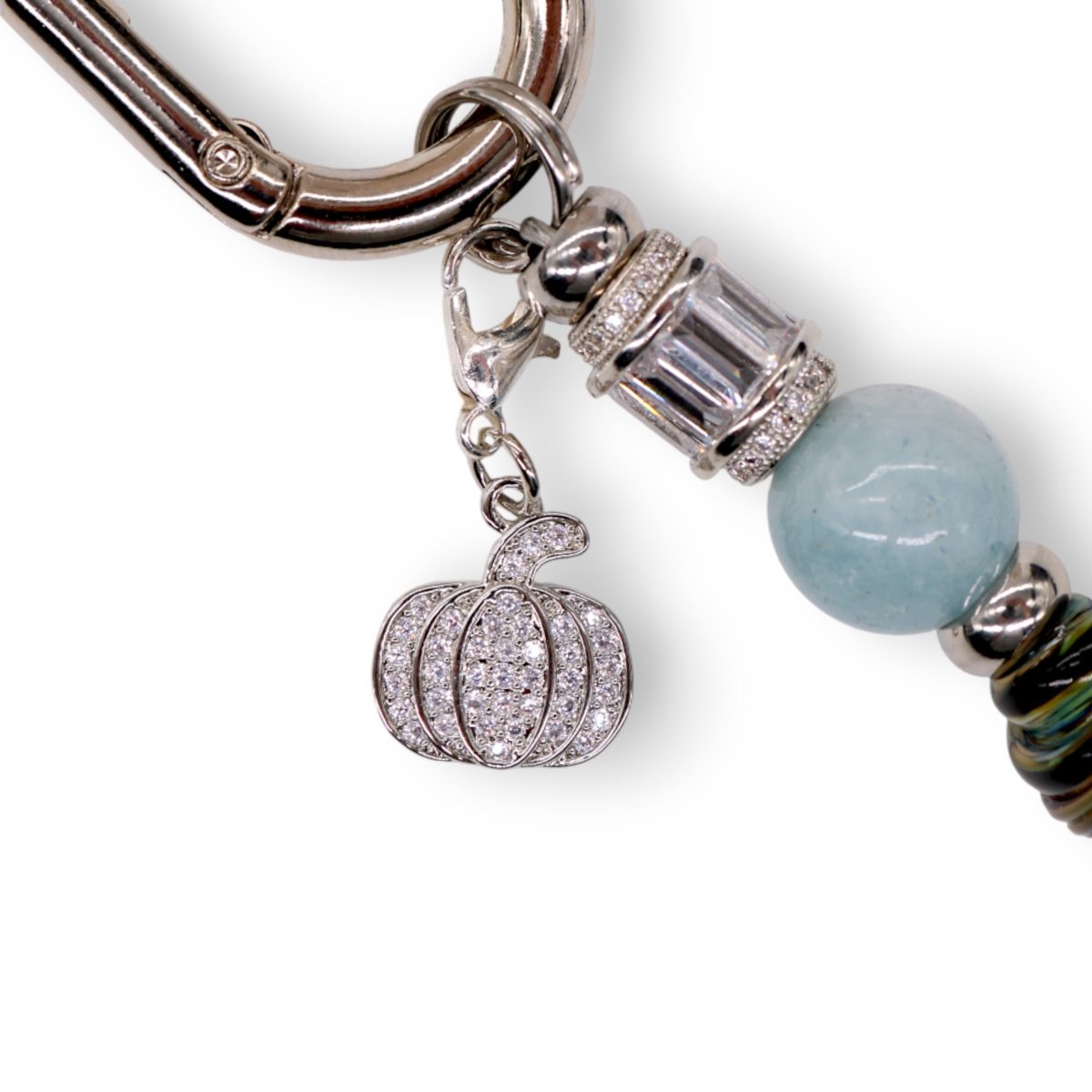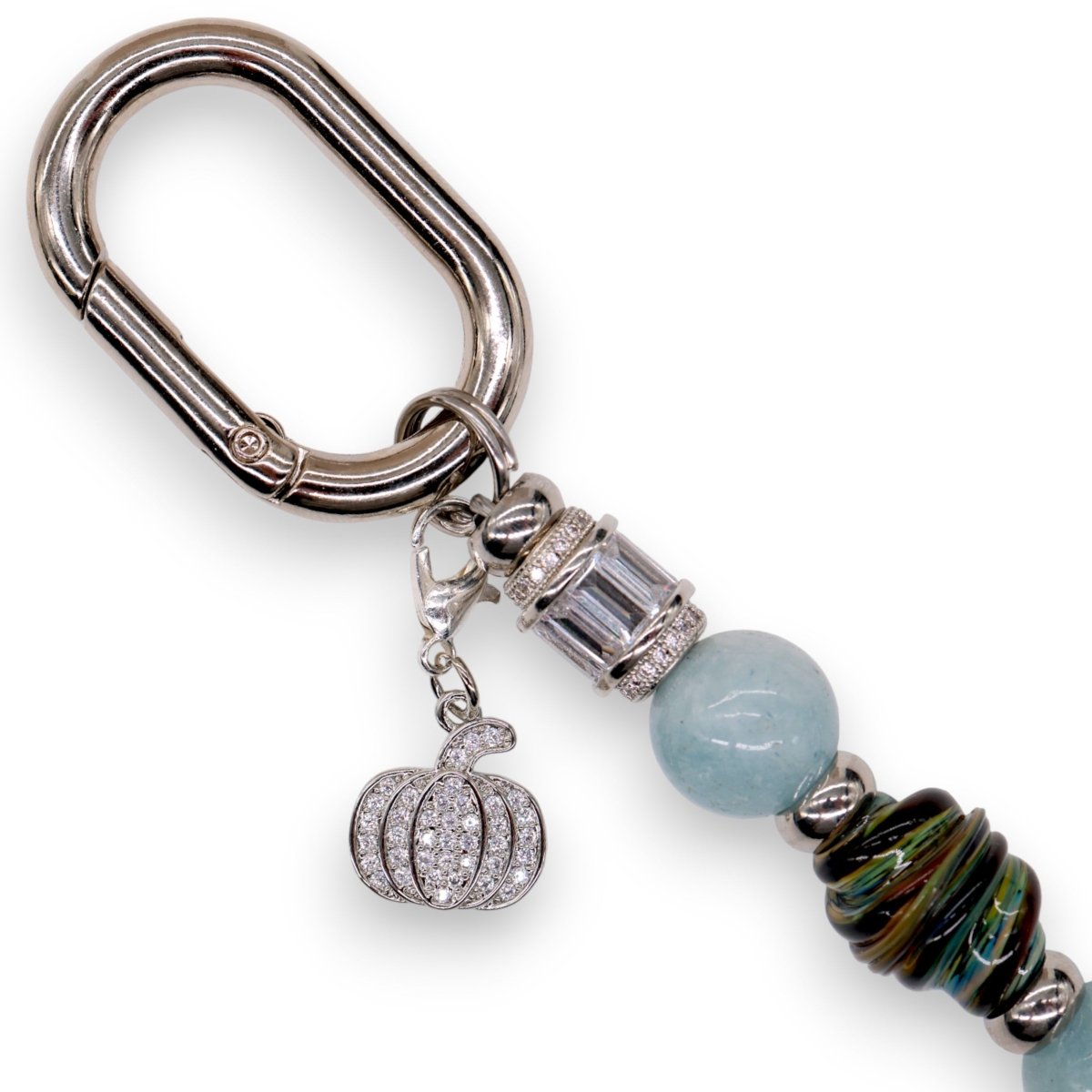 Finished with platinum-plated micro pavé end beads and a delicate pumpkin charm, Autumn Blues is a limited-edition masterpiece that adds timeless elegance to every handbag.