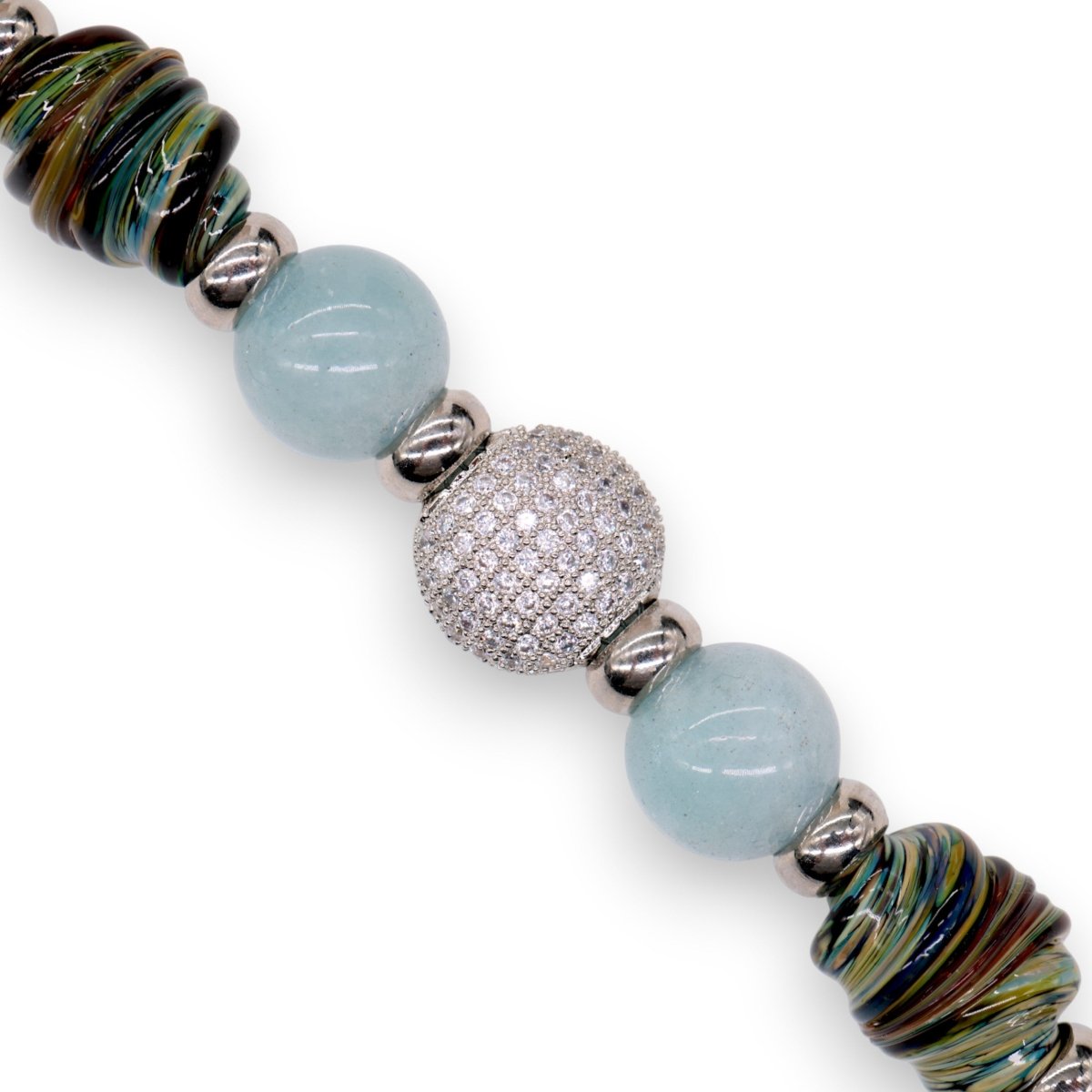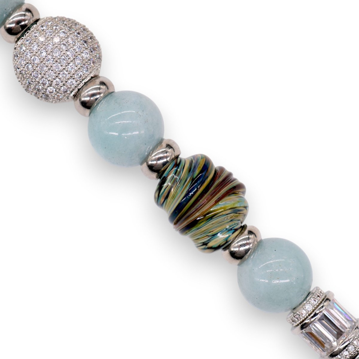 At its heart lies a platinum-plated micro pavé center bead, glowing with soft, refined sparkle. Surrounding it are genuine Aquamarine gemstones, among the world’s most coveted stones, admired for their tranquil ocean hue and unmistakable luxury. Two handblown glass lampwork beads, created by a master artist in British Columbia, bring an artful, one-of-a-kind touch — no two are ever alike.