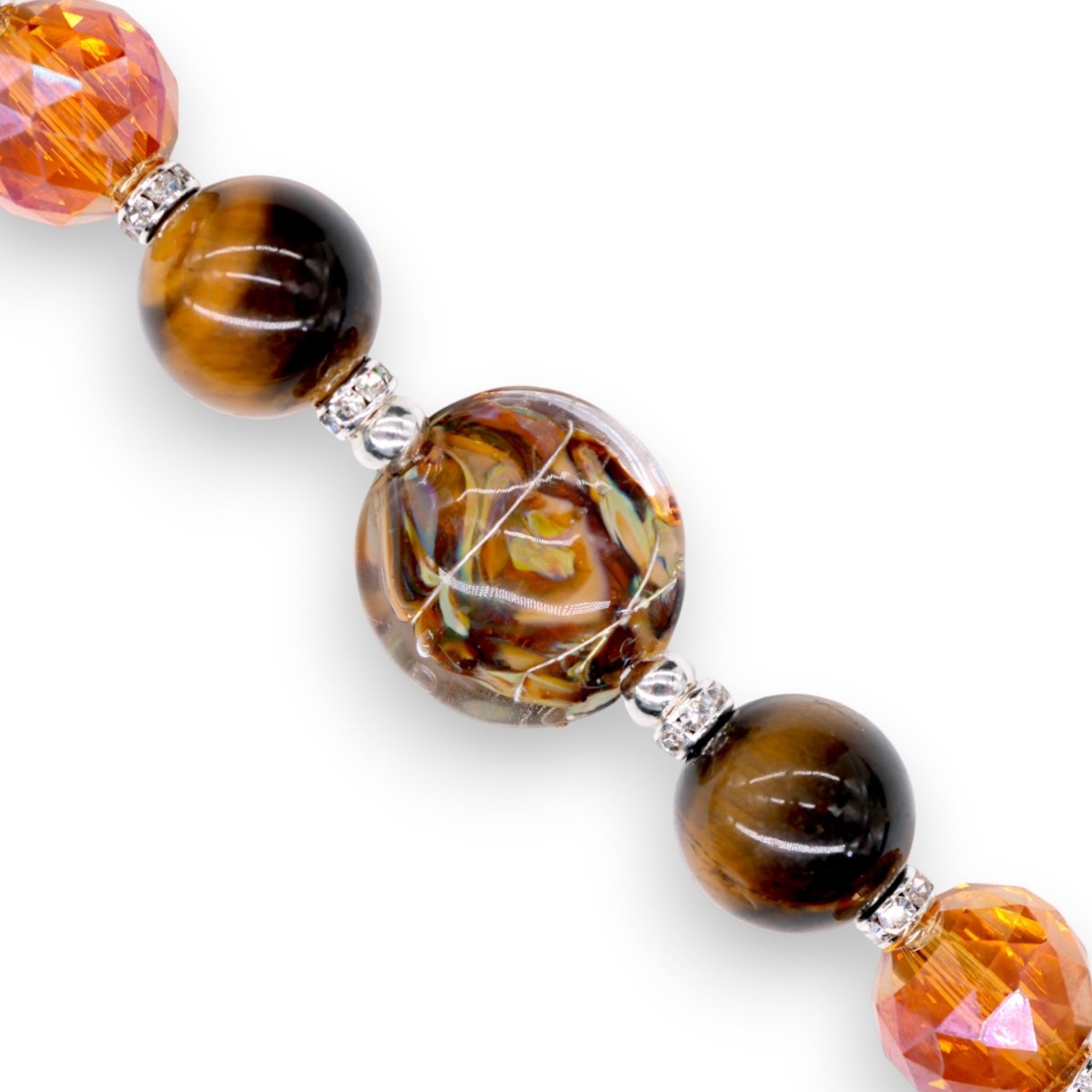 Surrounding this extraordinary focal point are genuine tiger eye gemstones, admired for their deep, earthy tones and natural luster, alongside faceted electroplated burnt orange crystal glass beads that reflect light like a canopy of autumn leaves in motion.