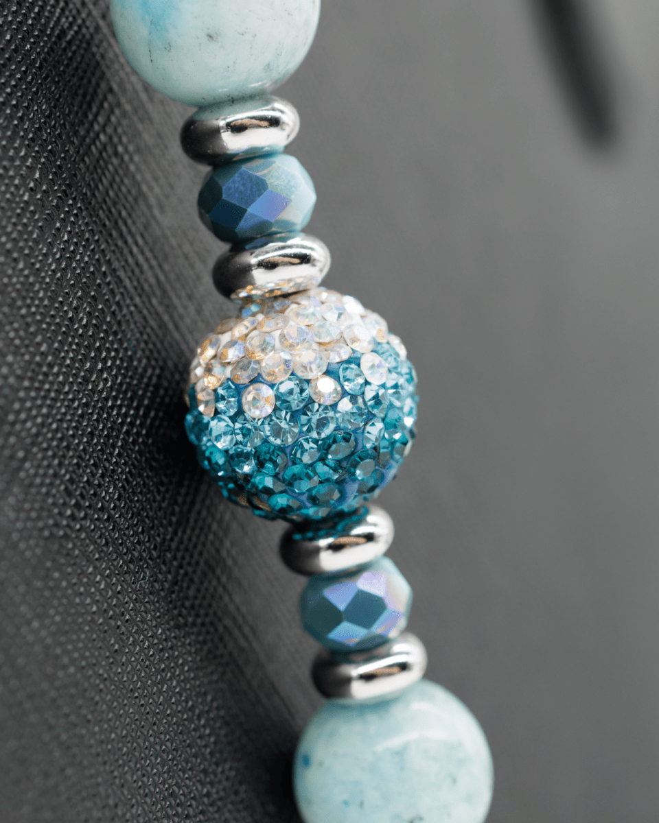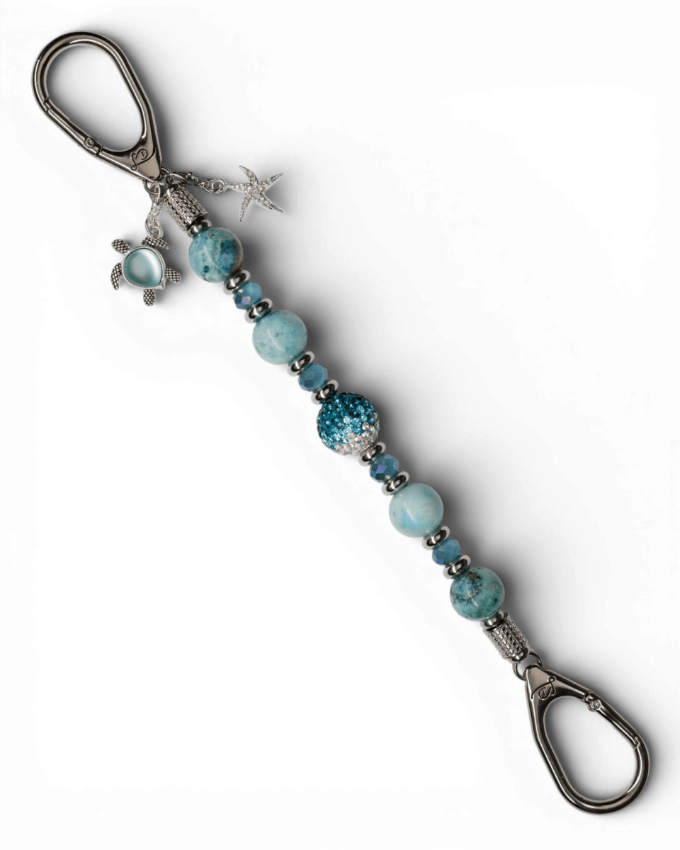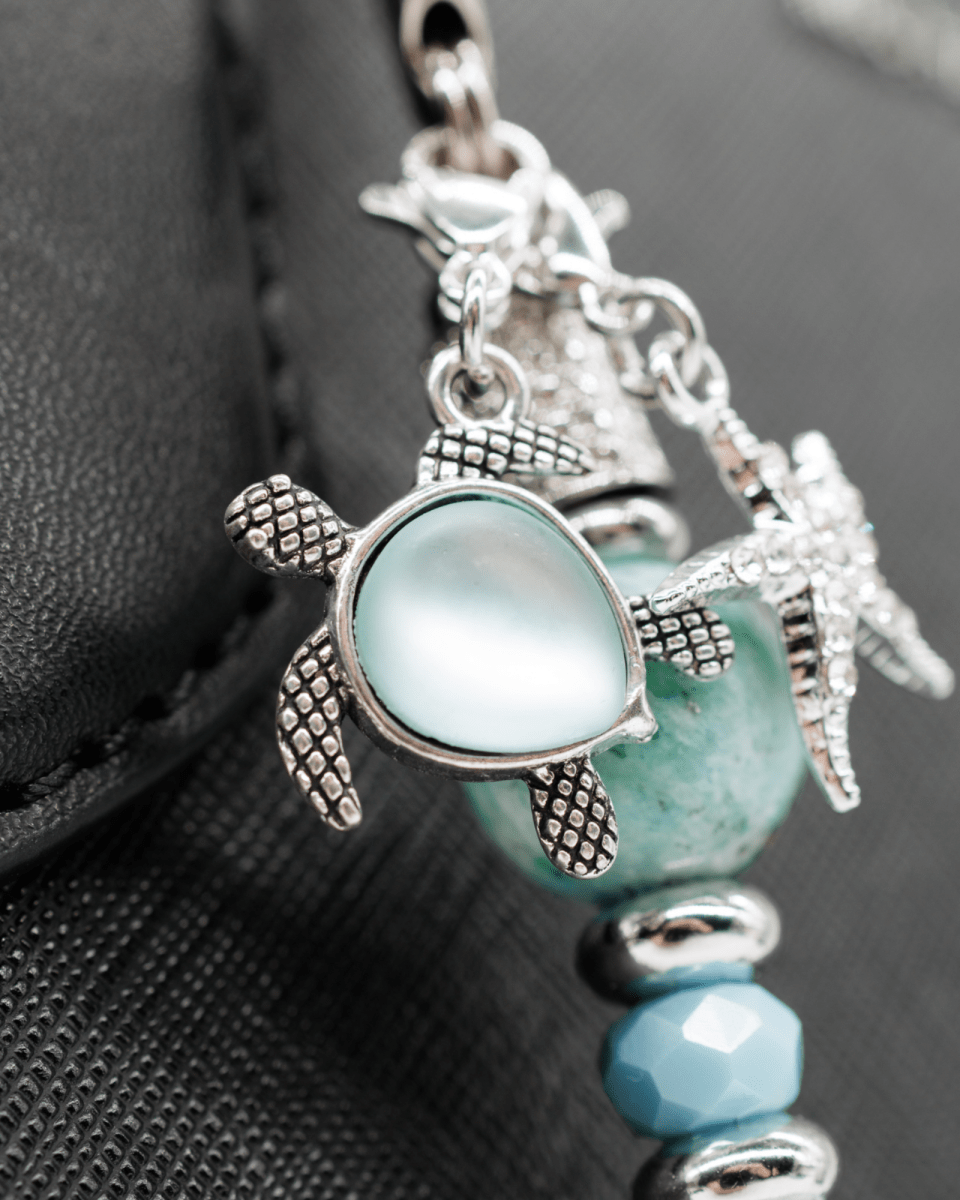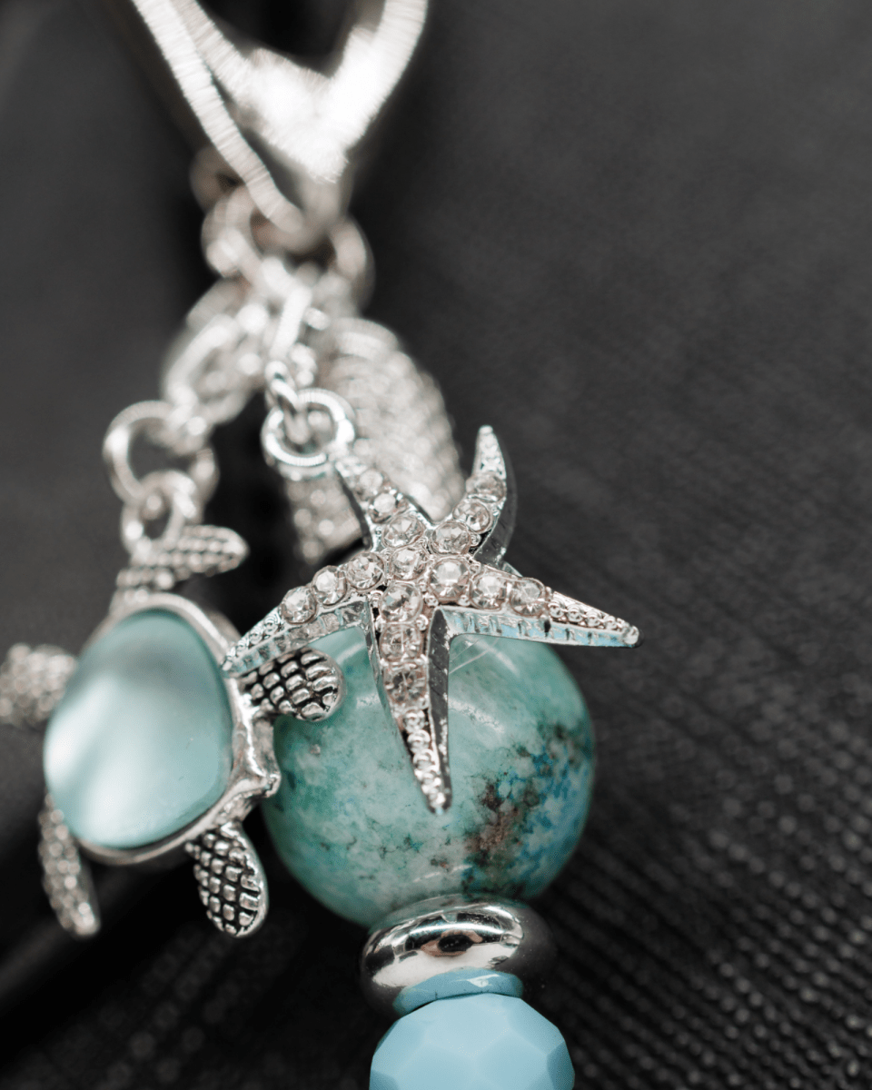 At its center shines a graduated dark-teal to iridescent Austrian crystal bead, shifting gracefully between deep ocean sapphire and shimmering aqua light. Surrounding it are aqua faceted electroplated glass beads that add luminous sparkle and fluid movement. Platinum-plated spacer beads and end beads complete the design with refined brilliance and polished sophistication. The piece is finished with a silver-plated aqua glass turtle charm and a sparkling silver-plated rhinestone starfish charm, celebrating the peaceful beauty and wonder of the ocean.