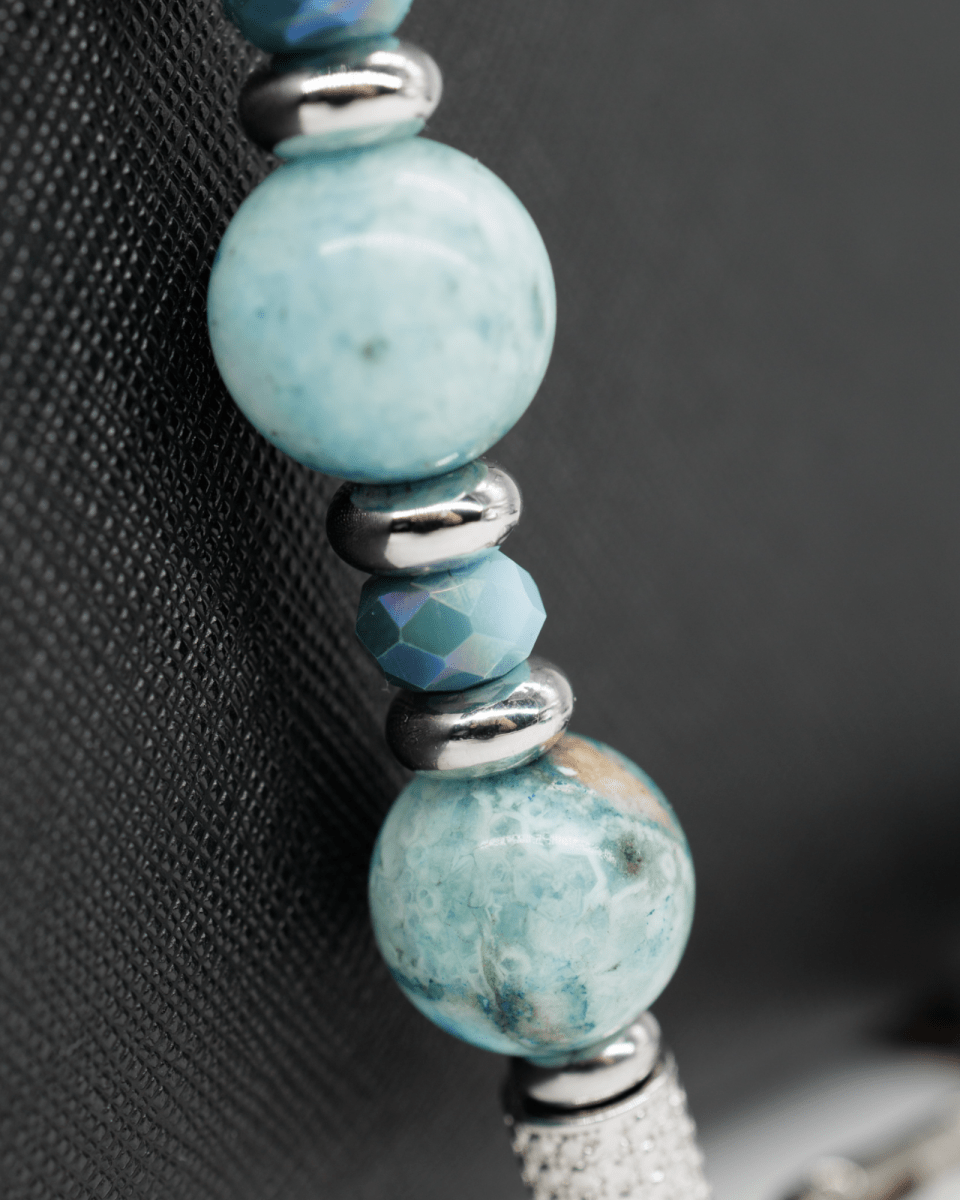 Coastal Tide is a graceful reflection of calm, clarity, and the soothing strength of the sea. Crafted with genuine hemimorphite gemstone beads from South Africa, this design features serene aqua and soft teal tones. Hemimorphite is often associated with emotional balance, compassion, and peaceful communication, making this piece both meaningful and beautifully calming.