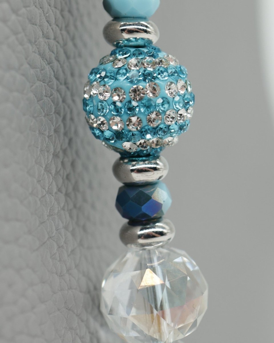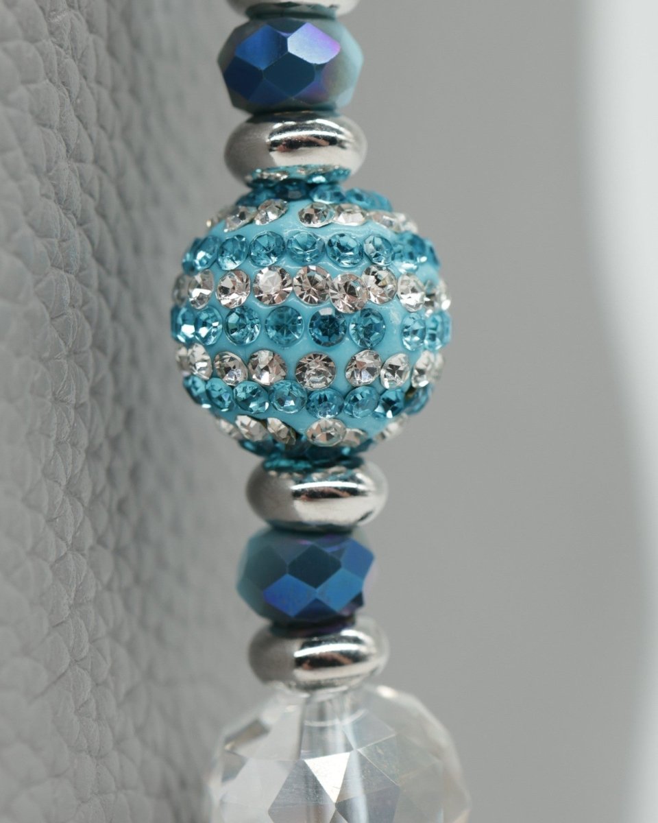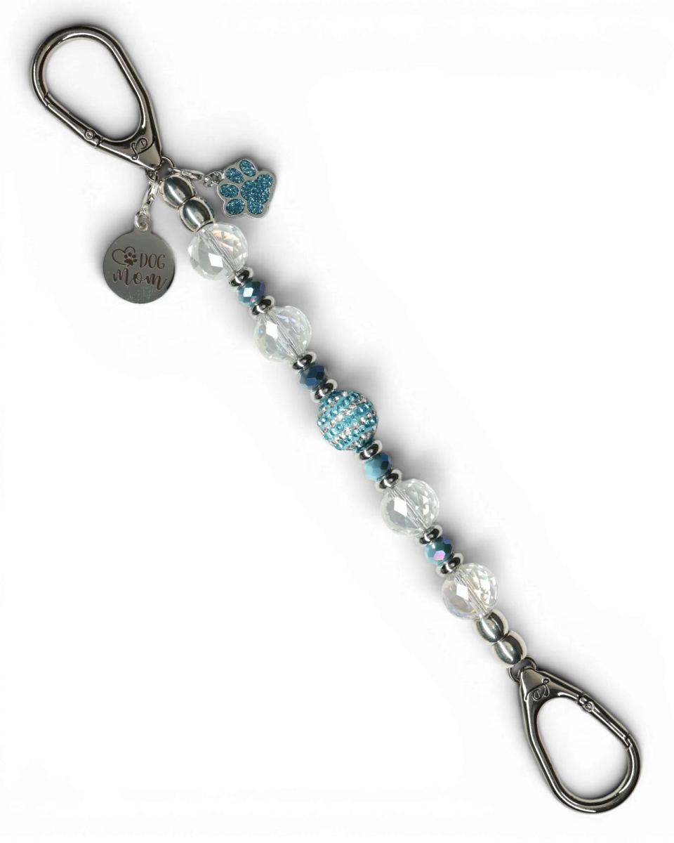 A sparkling celebration of every proud Dog Mom! Thoughtfully crafted with elegance and charm, this design features luminous electroplated icy glass beads that shimmer like morning frost and aqua blue faceted electroplated glass beads that reflect light with brilliant, ocean-inspired sparkle. At the heart of the piece, a stunning handcrafted center bead showcases a graceful stripe pattern created with teal and white Austrian crystals, adding depth, brilliance, and refined beauty while keeping your keys effortlessly within reach.