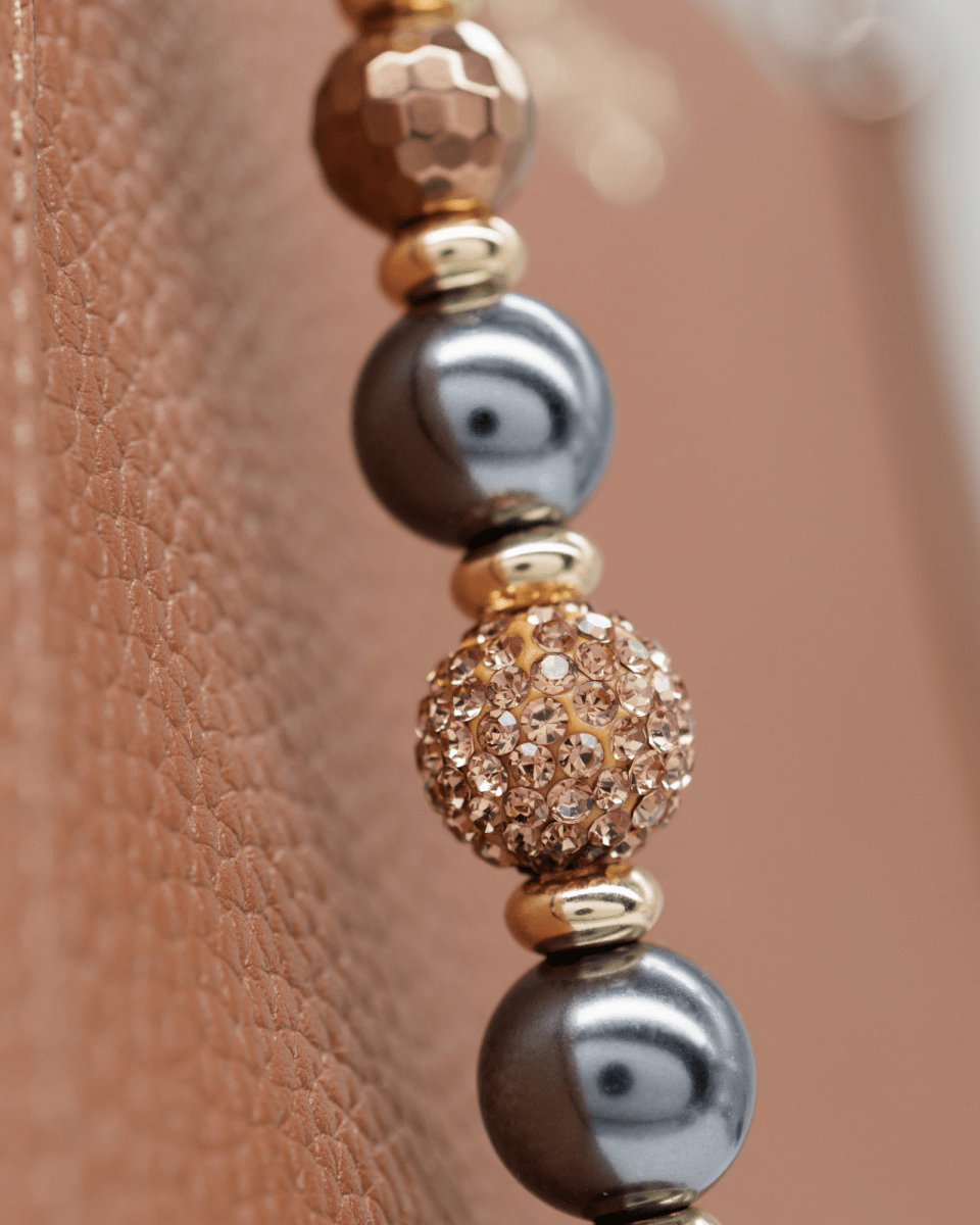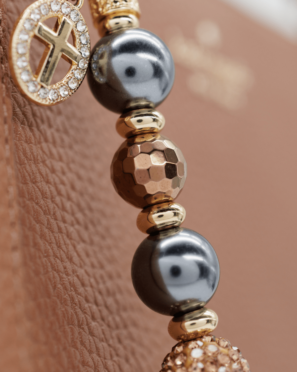 Soft slate grey pearl glass beads create an elegant, luminous foundation, while copper-plated hematite beads add grounding strength and warm metallic depth. At the heart of the design glows a brilliant Austrian crystal center bead infused with golden crystals, capturing light with every movement. Finished with 18KT gold-plated spacer and end beads for lasting brilliance, the design is completed with a sparkling rhinestone-accented golden cross charm - a timeless symbol of faith, protection, and devotion.