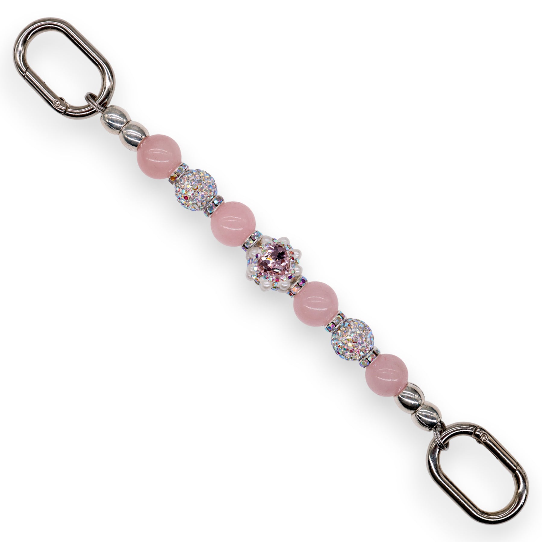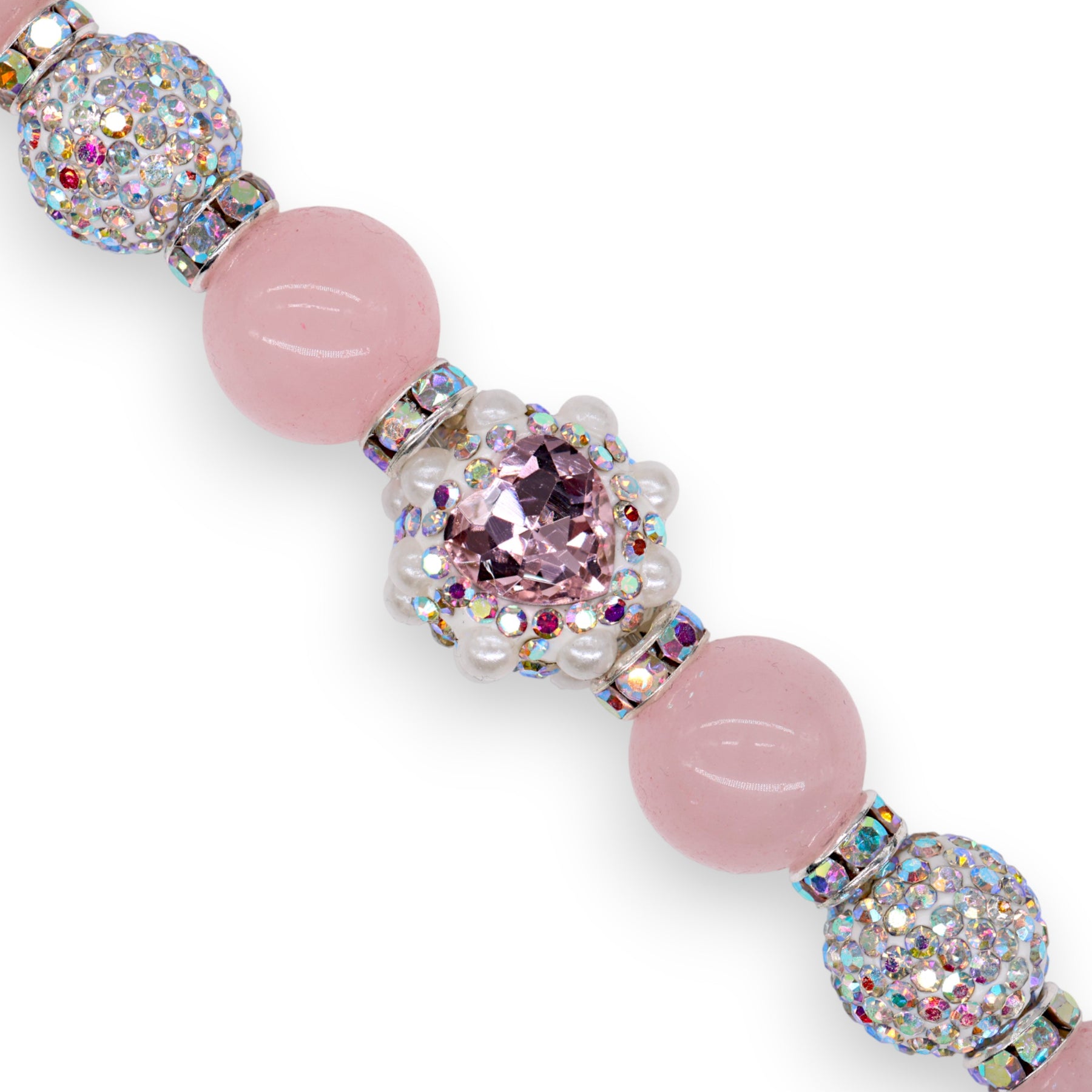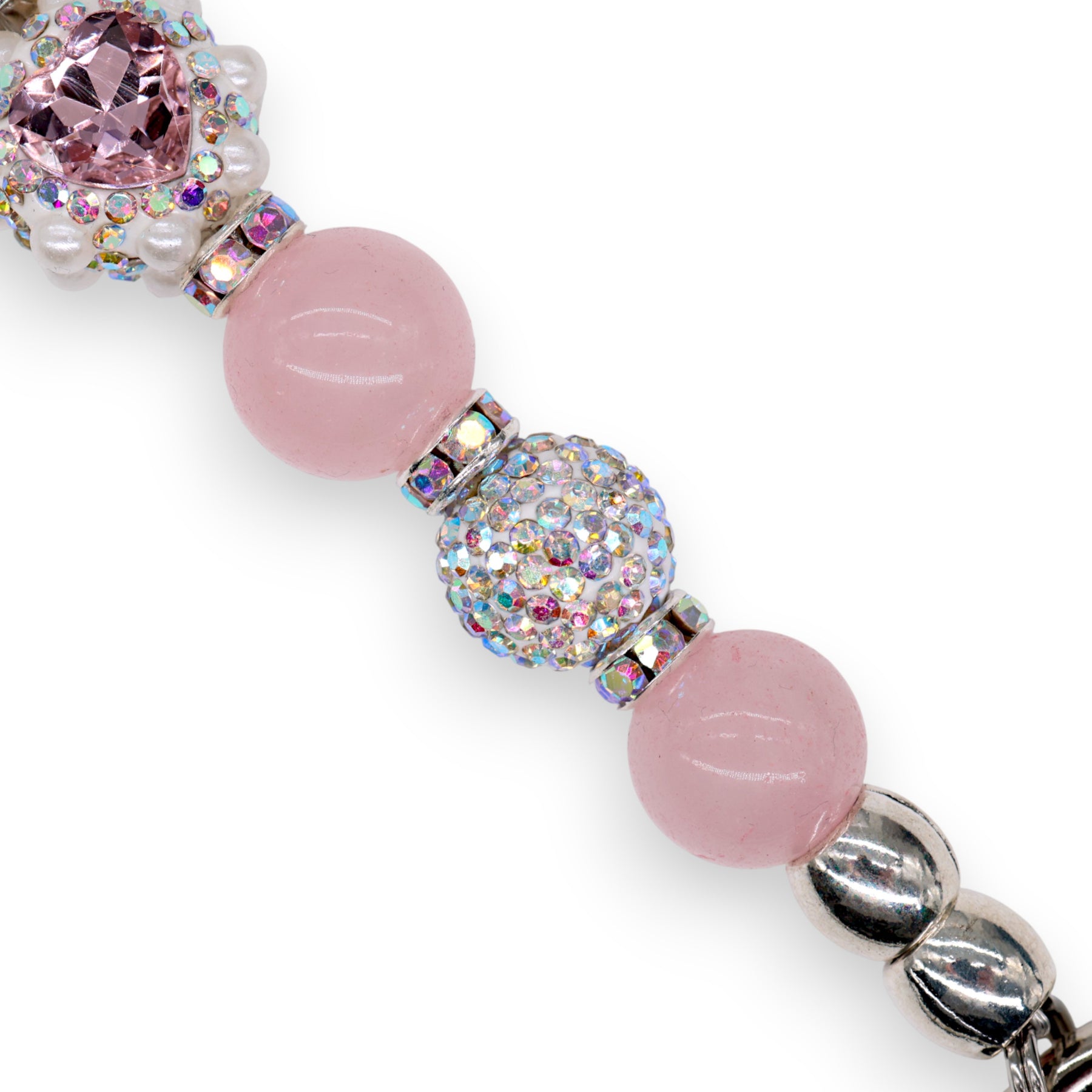 At the heart of the design is a handcrafted pink glass heart bead—shimmering with light-catching brilliance and symbolizing love, calm, and connection. Paired with soft rose quartz gemstone beads and iridescent Austrian crystals, Pink Peony radiates warmth and serenity with every glance.