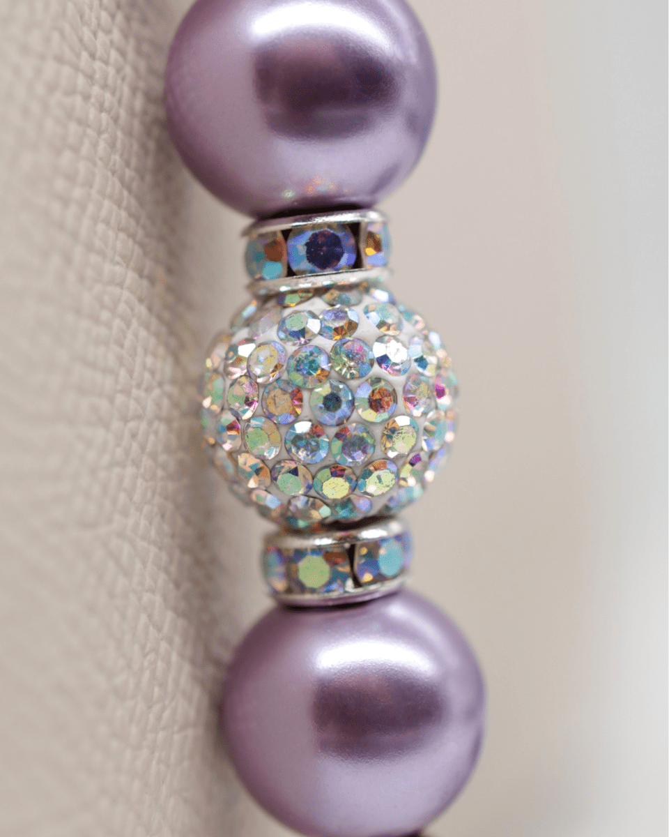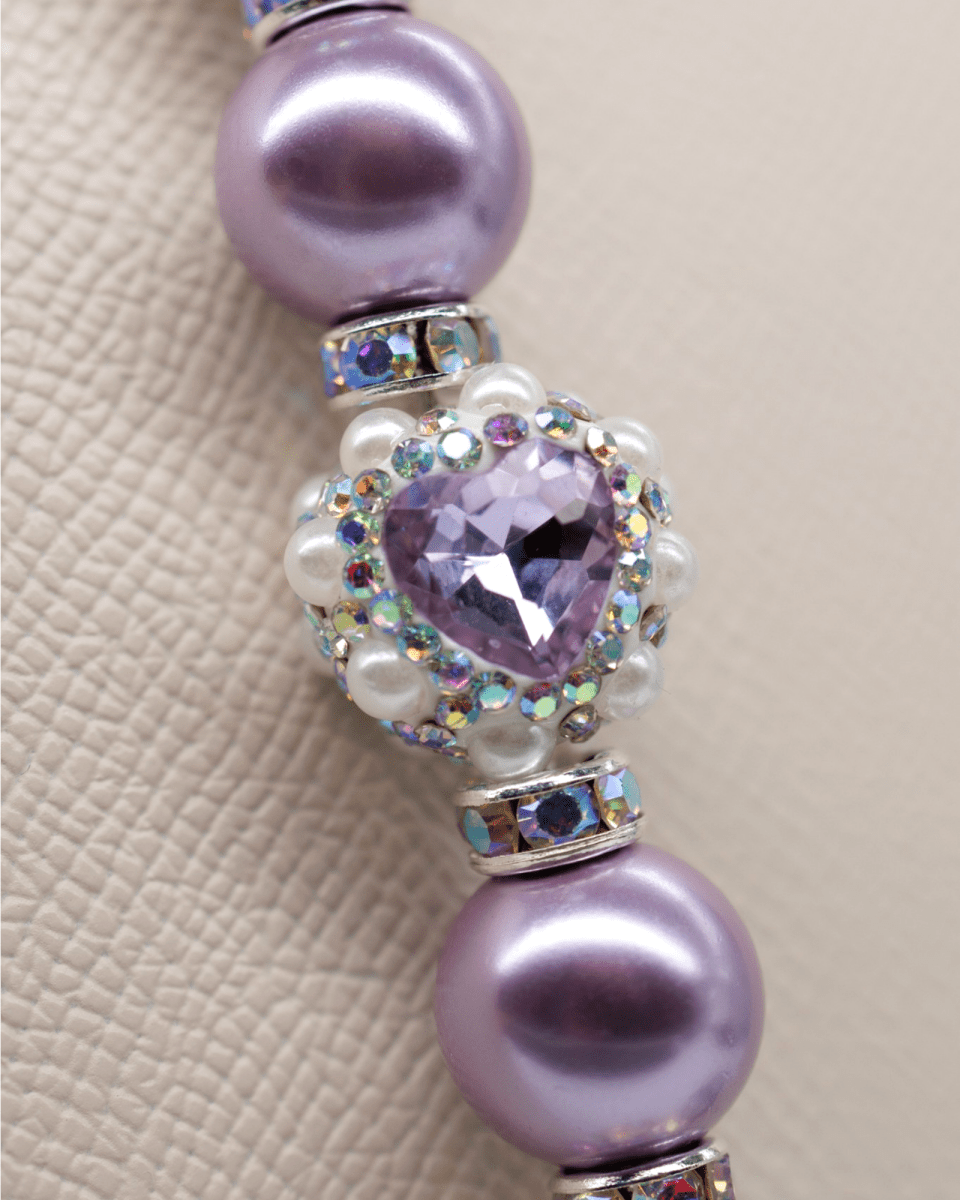 This luminous piece features soft lilac pearlized glass beads paired with genuine iridescent Austrian crystal beads that shimmer beautifully with every movement. At the center rests a handcrafted lilac heart bead, symbolizing love, beauty, and meaningful connection. The design is completed with a silver-plated lilac dragonfly charm, a graceful symbol of transformation, hope, and living life with lightness and joy.