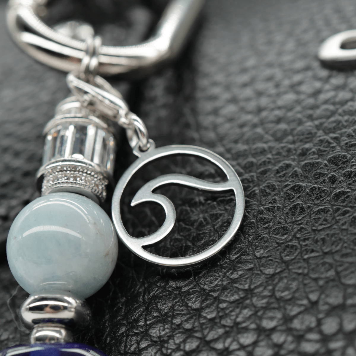 Genuine Aquamarine gemstones from Brazil surround the center bead, prized for their serene ocean color and long-held symbolism of clarity, calm, and emotional balance. Completing the design is a stainless steel ocean wave charm - a graceful symbol of flow, renewal, and life’s ever-changing tides.