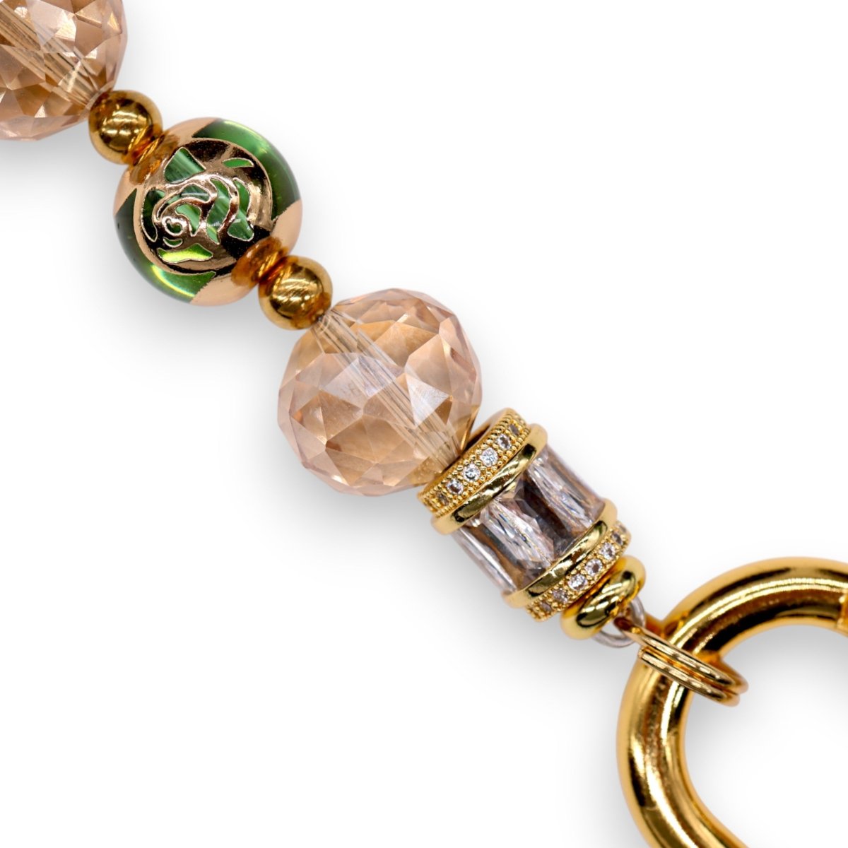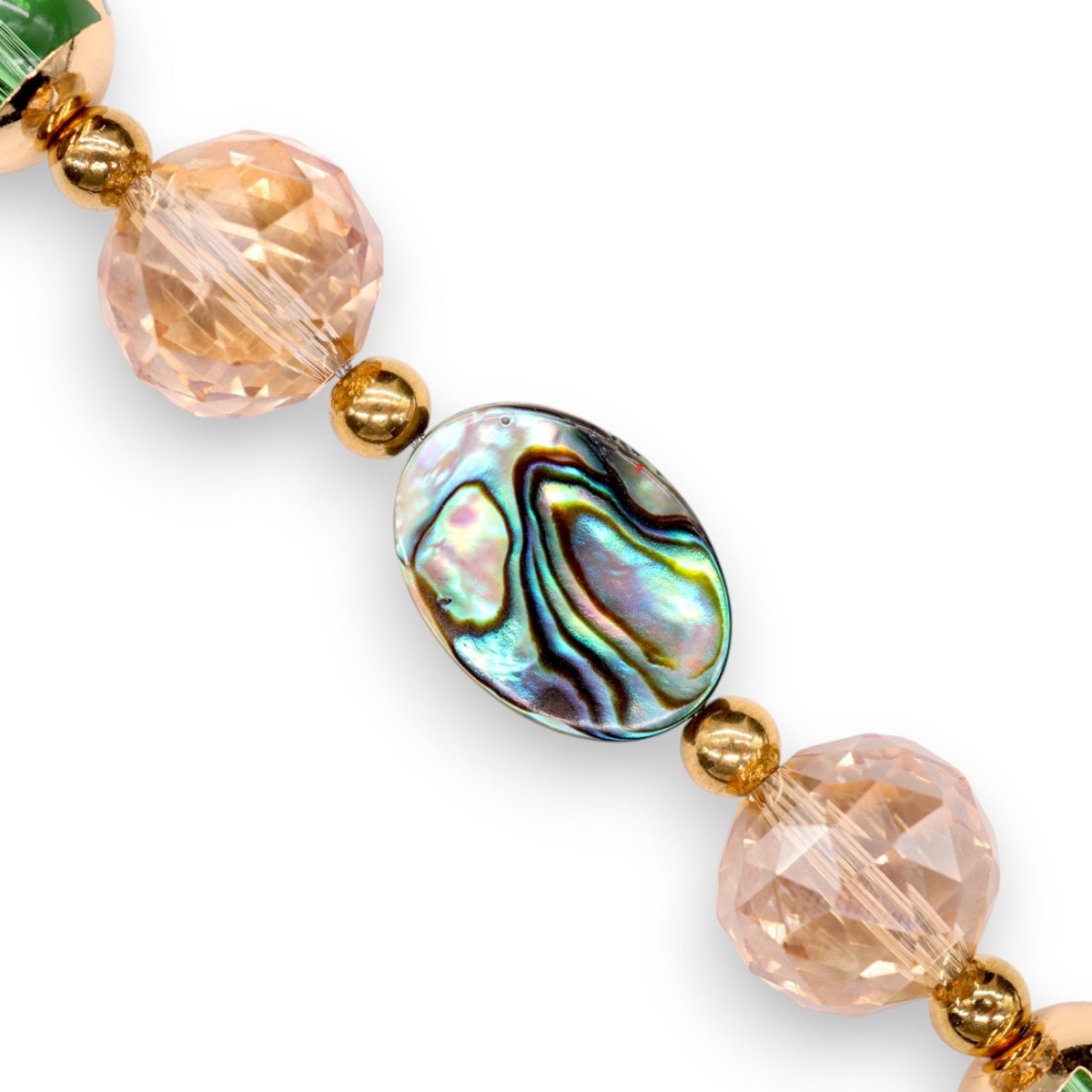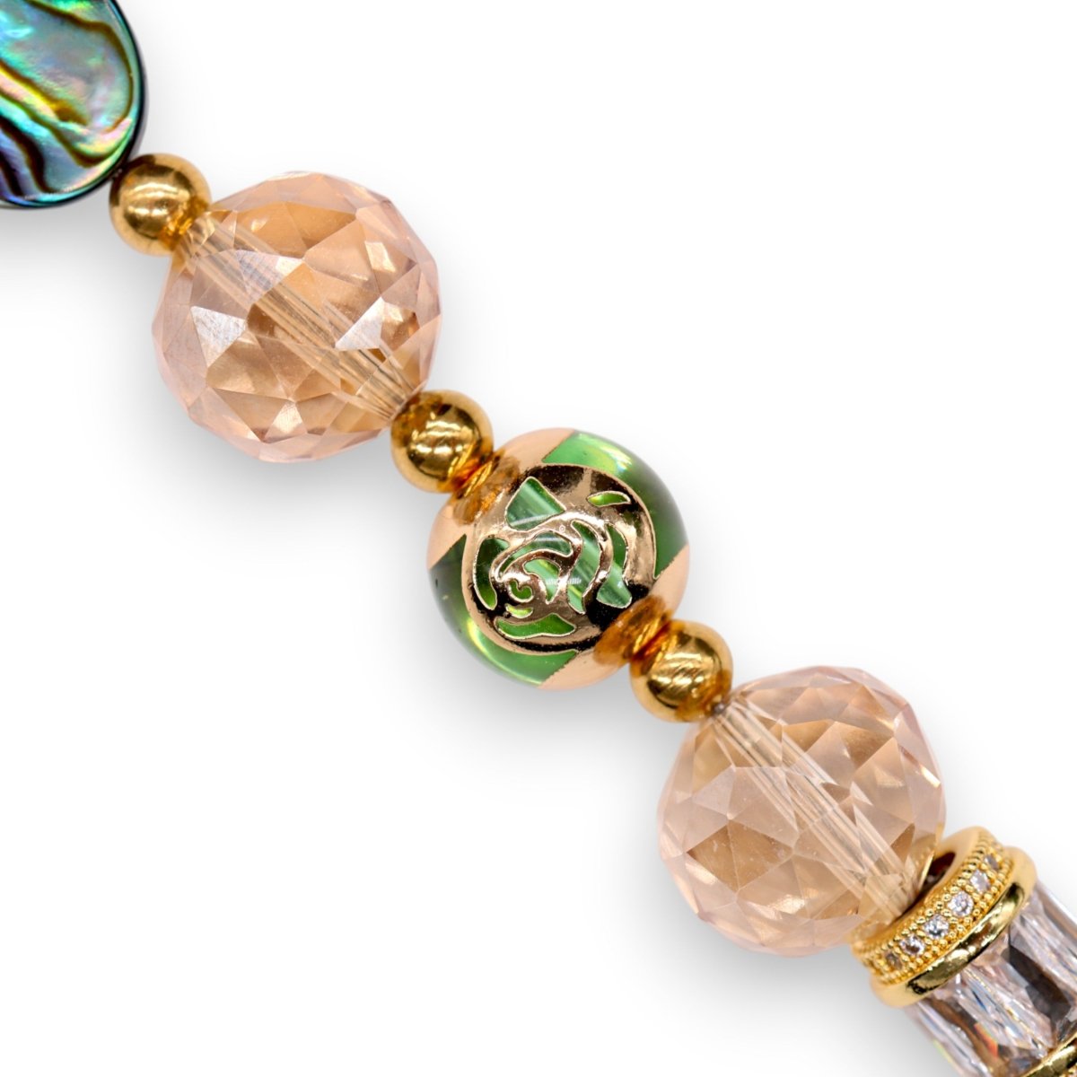 At its heart is a genuine abalone pāua shell bead, shimmering with natural iridescence that catches the light from every angle. It’s framed with 18KT gold-plated spacers and sparkling micro pavé baguette cubic zirconia end beads for just the right touch of brilliance.