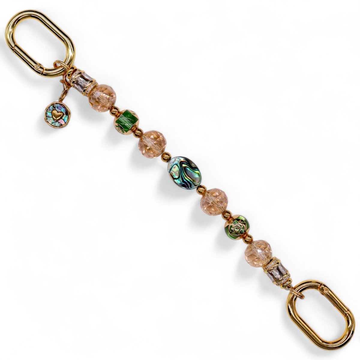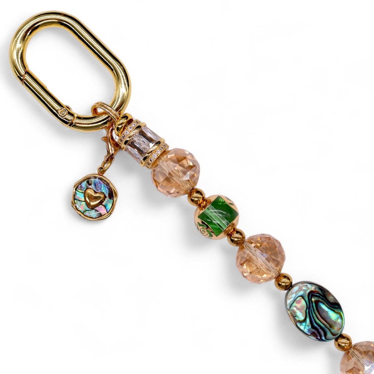 Faceted golden crystal glass beads and handcrafted lampwork beads with delicate gold-tone rose patterns bring warmth and detail to the design. And as the finishing touch, an 18KT gold-plated pāua shell heart charm adds a little extra love and meaning.