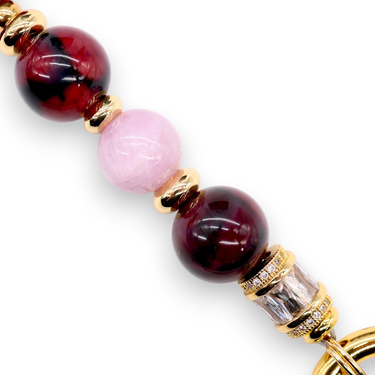 At the heart of Crimson Fleur is a handmade lampwork glass bead, created by a California glass artist and delicately designed with raised glass tiny flowers. Surrounding it are dark crimson red dragonvein agate beads and genuine kunzite gemstones sourced from Nigeria — soft, dreamy stones believed to inspire calm and love.