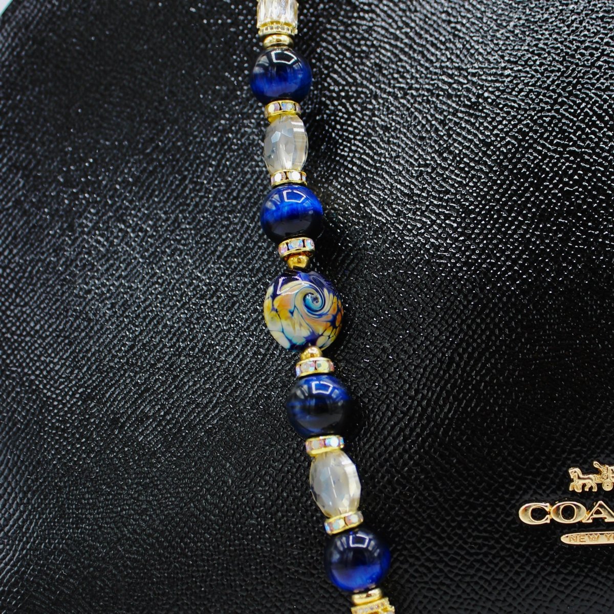 A royal combination of rich indigo hues and polished 18K gold-plated hardware harmoniously blend together to create this statement piece.