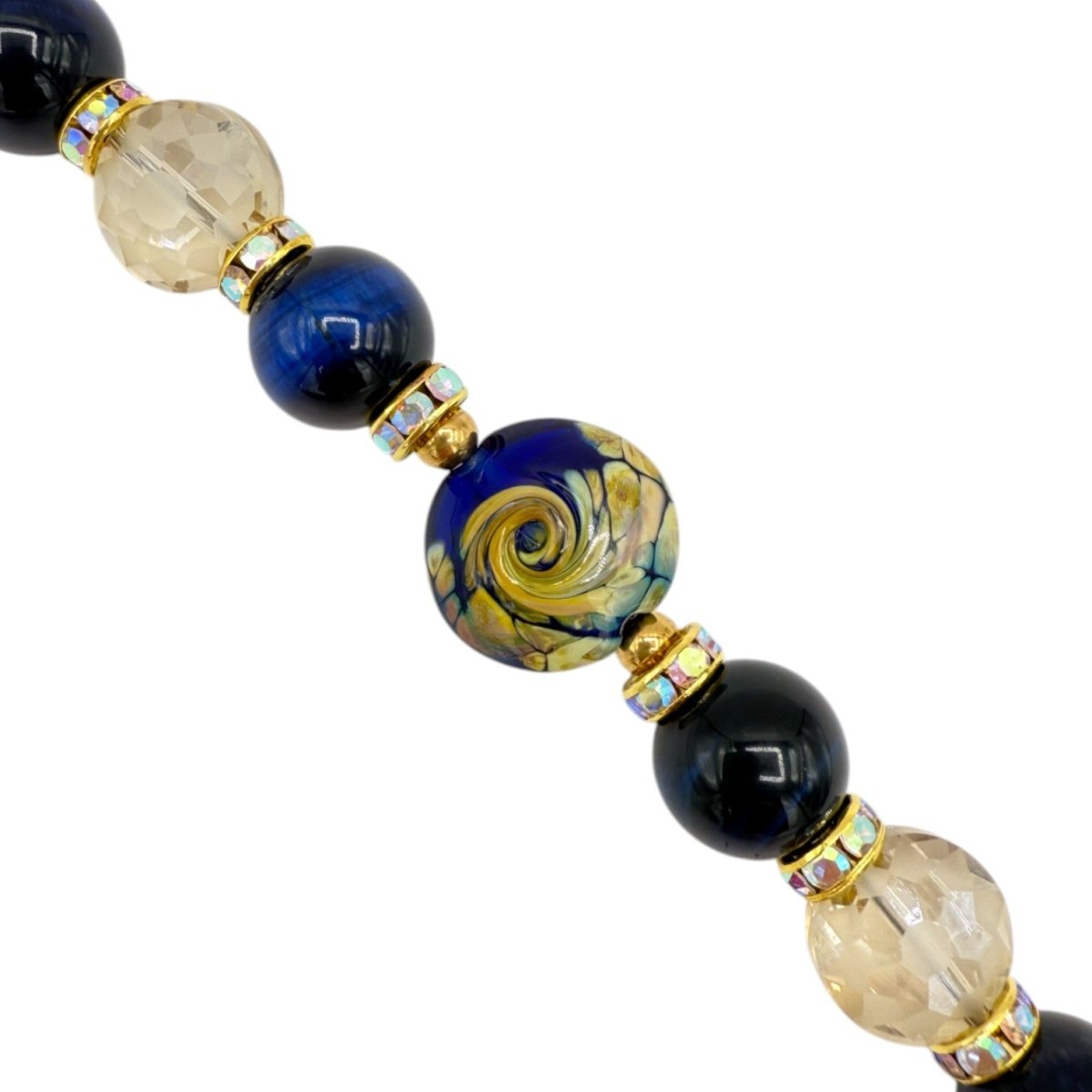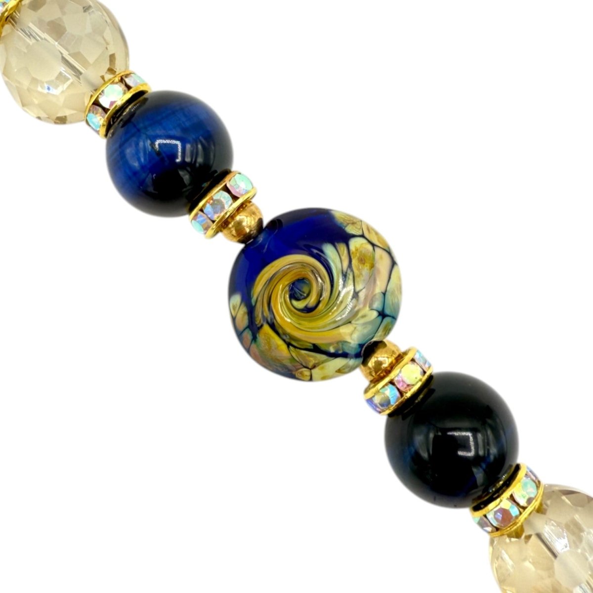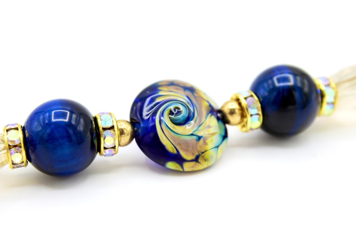 At its centre, lies a handmade Deep Blue Lampwork Glass Lentil bead, sourced from a talented glass artisan in British Columbia, Canada. Reminiscent of moonlit ocean waves crashing against the stunning beaches of Canada’s Pacific coastline, this bead is a tribute to the natural beauty of its origin.