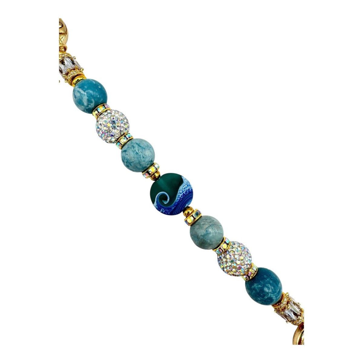 At its center lies a handblown glass bead, meticulously crafted by a master glass artisan in British Columbia, Canada. With swirls of deep aqua and shimmering gold, this bead captures the essence of sunlight dancing on ocean waves, making it a true collector’s piece.