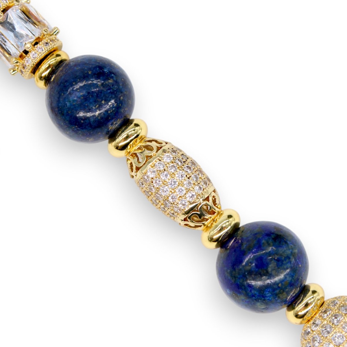 This limited-edition design is lovingly accented with three 18KT gold-plated micro pavé beads, each one meticulously encrusted with shimmering stones that catch the light from every angle. Their brilliance adds a refined layer of opulence, elevating the entire piece to heirloom-worthy status.