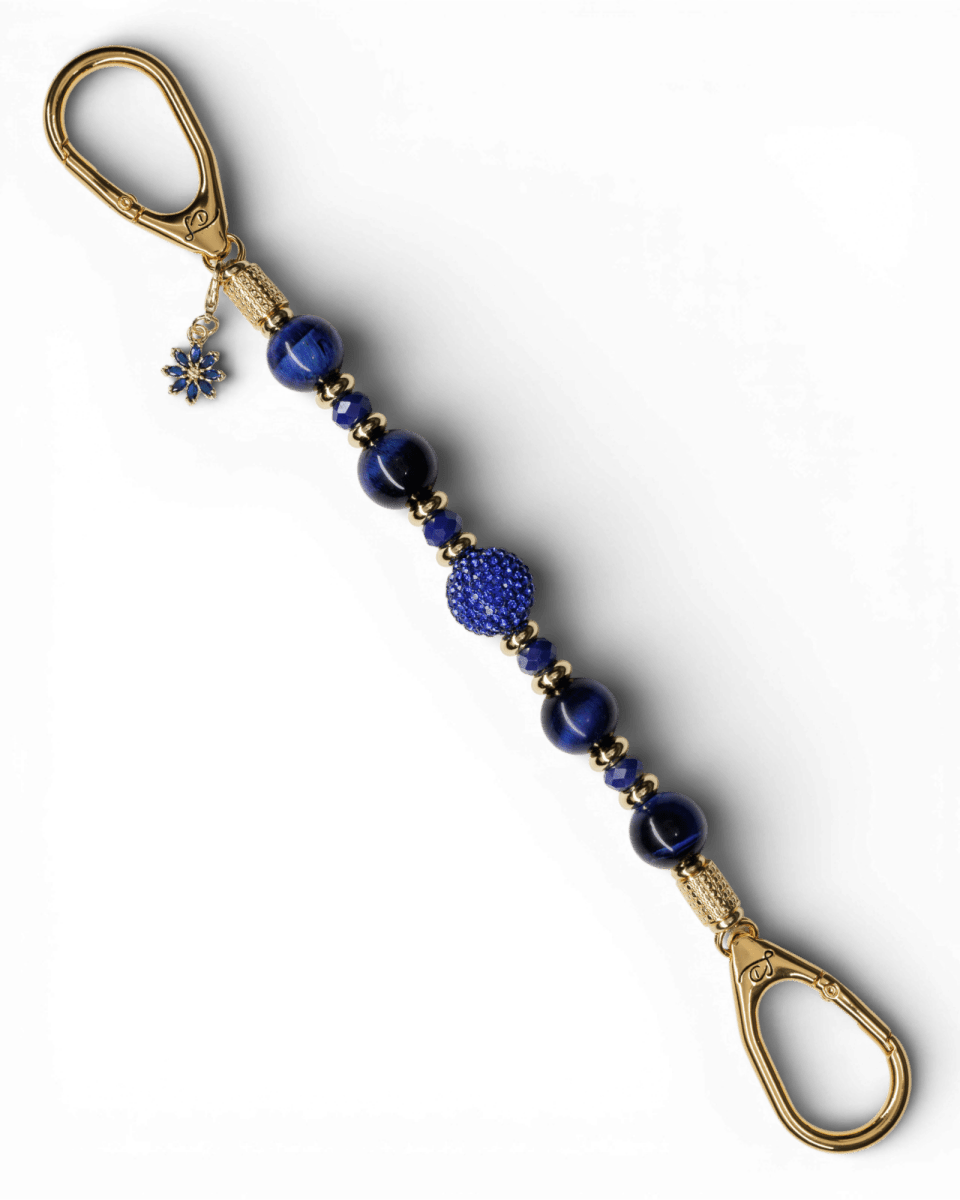 This striking piece features genuine dark blue tiger’s eye gemstone beads that glow with deep sapphire and midnight tones. At the center sits a breathtaking handcrafted Austrian crystal bead in deep sapphire, adding brilliant depth and sparkle. Faceted electroplated blue glass beads enhance the luminous color, while 18KT gold-plated spacer beads and end beads bring warmth and polished sophistication. The design is finished with an 18KT gold-plated Prussian blue glass daisy charm, symbolizing joy, renewal, and beauty in full bloom.