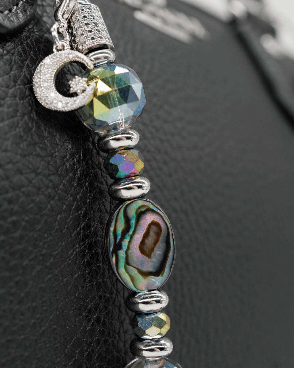 At its center glows a luminous abalone shell bead with iridescent tones of blue, violet, and green. Surrounding it are electroplated rainbow crystal glass beads that shimmer like the shifting colors of the aurora. Platinum-plated spacer beads and end beads add refined brilliance, while a platinum-plated micro pavé moon and star charm with cubic zirconia completes the celestial look.