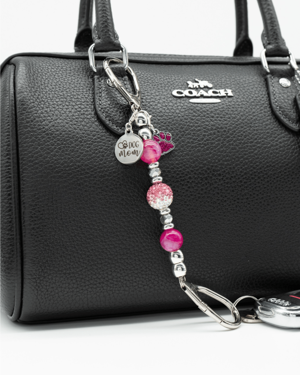 This mini design features genuine fuchsia pink dragonvein agate gemstone beads paired with pink and silver electroplated faceted glass beads for vibrant sparkle. At the center shines a stunning handcrafted bead in shades of pink to iridescent, adding beautiful color movement and luminous shine. The design is completed with two meaningful charms - a stainless steel “Dog Mom” charm and a stainless steel pink dog paw charm, honoring the unconditional love shared with your furry companion.