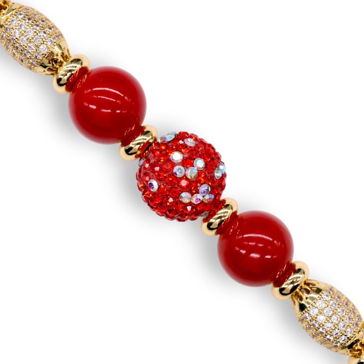 At its heart glows a brilliant red and iridescent Austrian crystal center bead, capturing the warmth of candlelight and the joy of the holiday season. Surrounding it are luminous red pearl glass beads and two 18KT gold-plated micro pavé barrel beads, radiating a rich golden brilliance that feels both festive and timeless. The design is accented with 18KT gold-plated spacers and baguette-cut pavé end beads, adding a touch of refined luxury. Finished with a gold-plated micro pavé Christmas tree charm - set with red enamel and sparkling stones - Crimson Noel embodies the elegance, light, and spirit of Christmas in one radiant creation.
