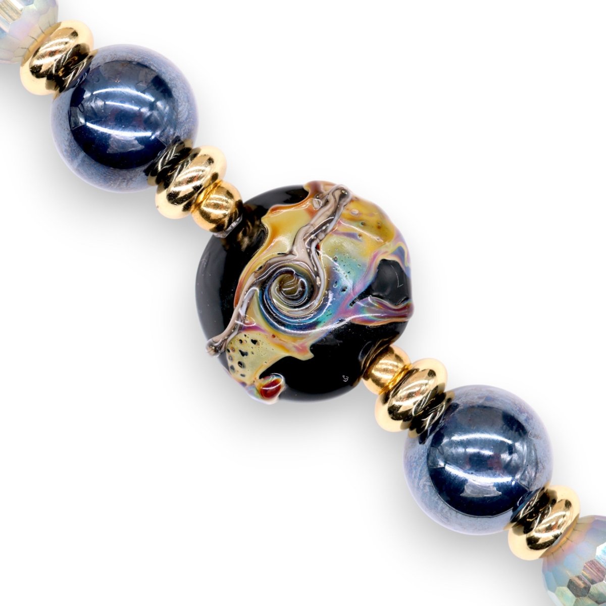 At the heart of Midnight Mirage is a breathtaking, handcrafted glass bead created by a Michigan glass artist, infused with delicate strands of real silver that shimmer like starlight against the night sky. Surrounding it are rich midnight blue glass pearl beads paired with electroplated rainbow faceted glass beads, reflecting light in a mesmerizing dance of shifting color — like a mirage unfolding beneath the stars.