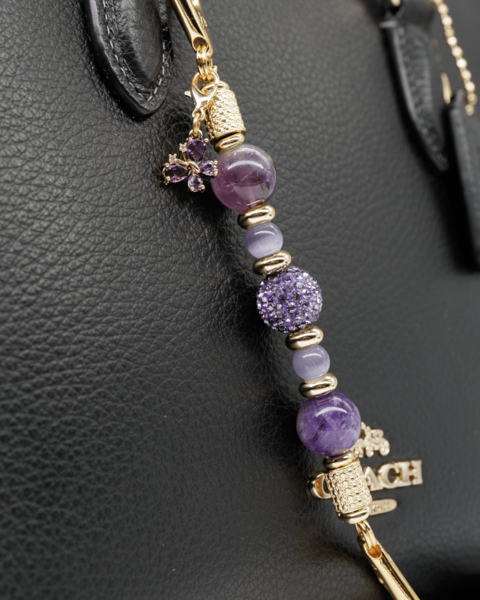 This mini design showcases genuine amethyst gemstone beads paired with luminous purple cat’s eye beads for soft glow and depth. At the center is a handcrafted purple Austrian crystal bead that adds radiant sparkle, while 18KT gold-plated spacer beads and end beads provide warm elegance. A micro pavé rhinestone purple butterfly charm completes the design, symbolizing transformation, joy, and new beginnings.