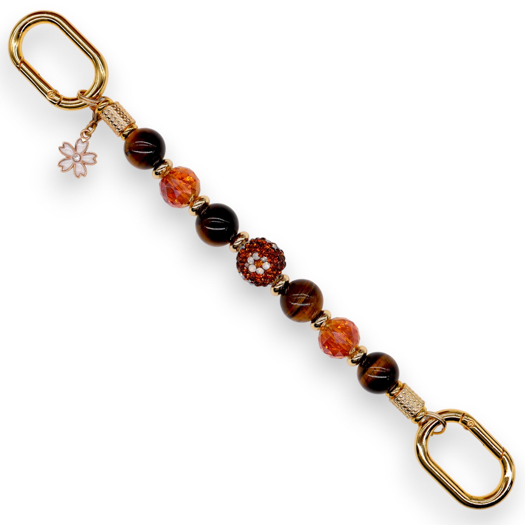 At its heart is a handcrafted center bead adorned with auburn rhinestones in a daisy design, symbolizing renewal and the simple beauty of the season. Surrounding it are genuine tiger eye gemstone beads and electroplated burnt orange faceted crystal glass beads, all accented with 18KT gold-plated spacers. A gold-plated white daisy charm completes the design with a graceful finishing touch.