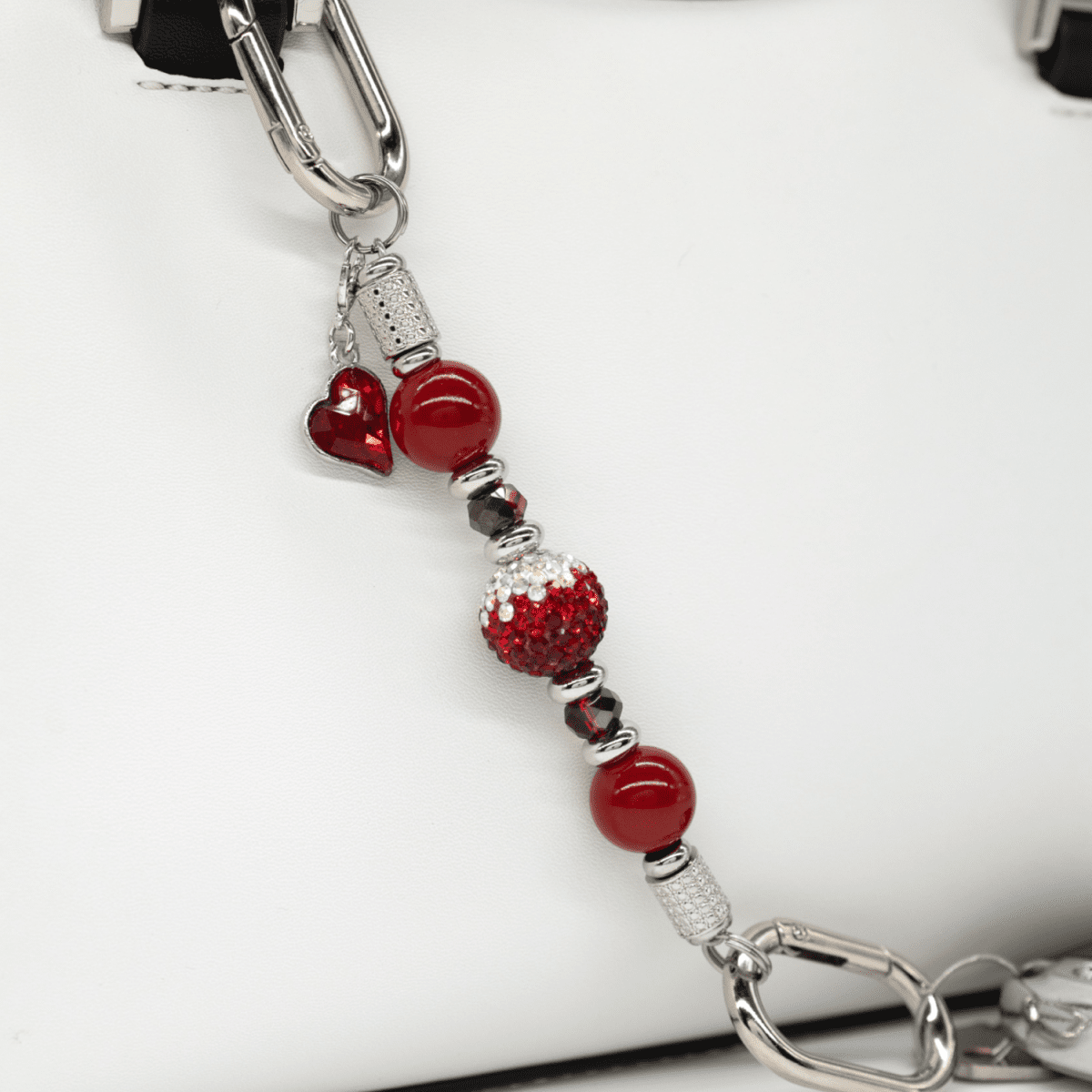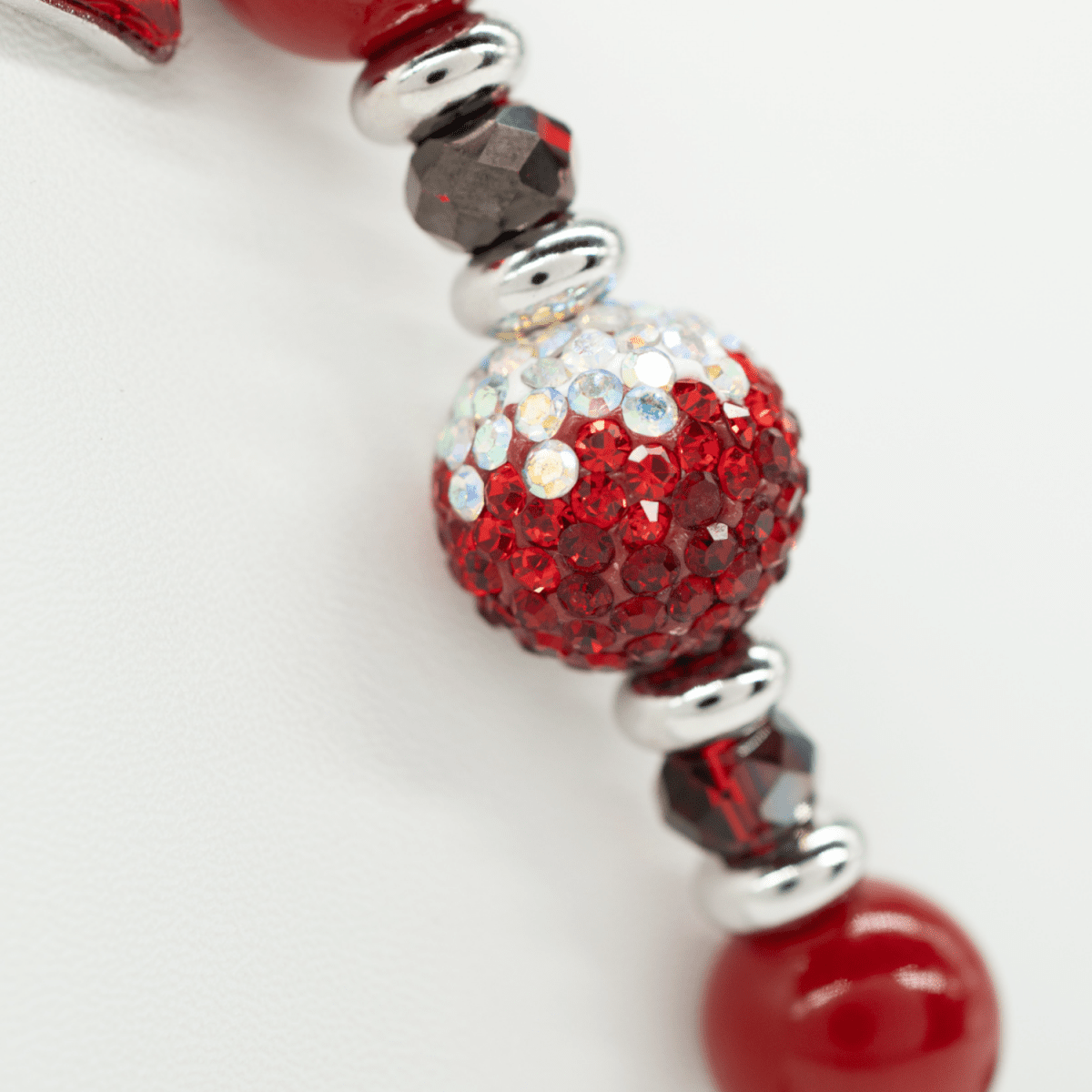 At its heart glows a stunning handcrafted center bead, featuring shades of rich red that gracefully graduate into iridescent shimmer - a captivating focal point that catches the light with every movement. Surrounding it are lustrous Venetian red pearl glass beads, adding depth and warmth with their timeless elegance. Electroplated red and silver faceted glass beads bring bold contrast and mesmerizing sparkle, while stainless steel ball spacers ensure lasting shine without tarnish. Platinum-plated end beads provide a polished, refined finish. Completing this petite design is a brilliant platinum-plated red glass heart charm, sparkling with passion and love.
