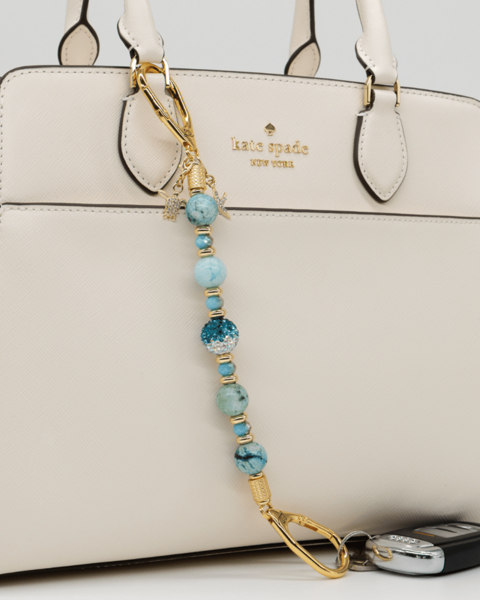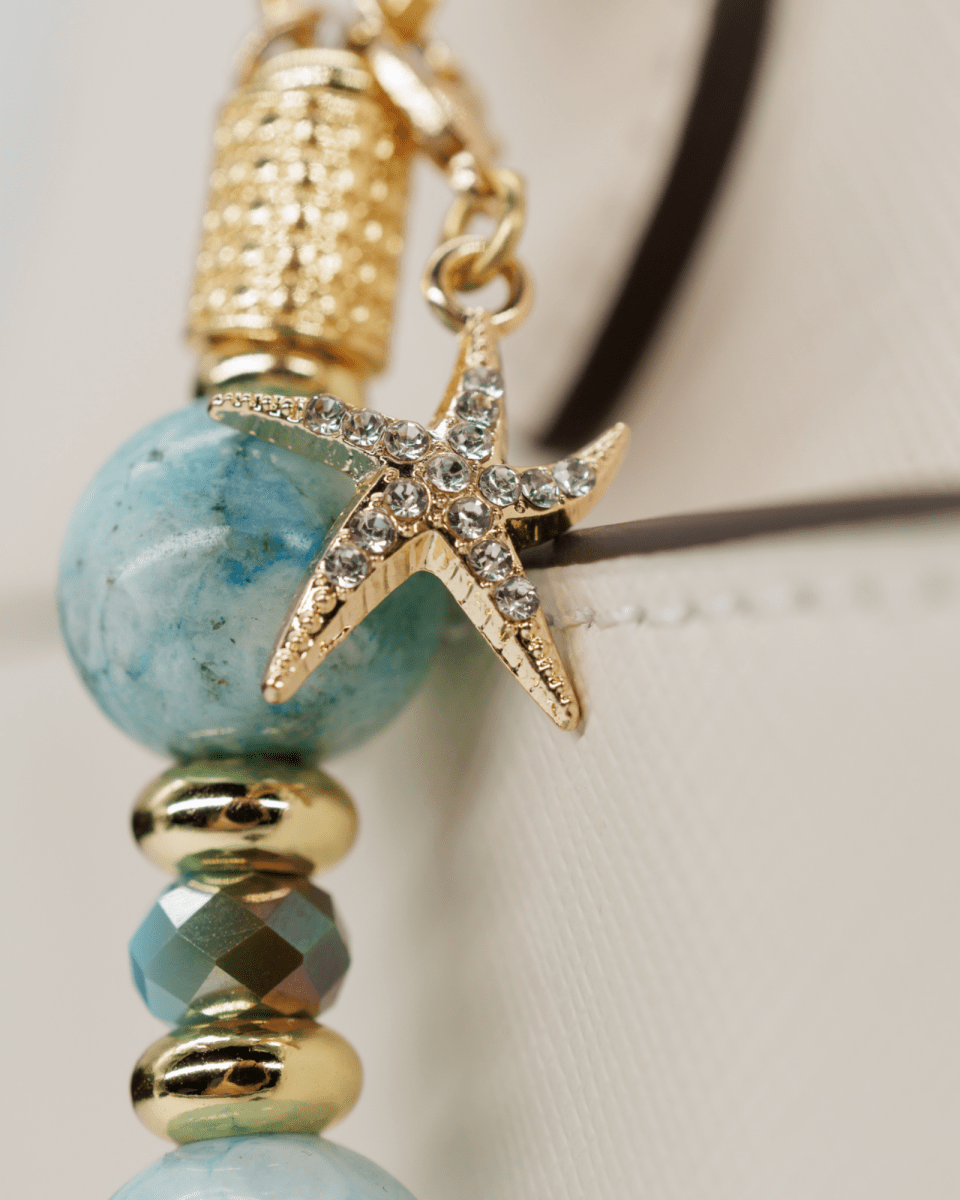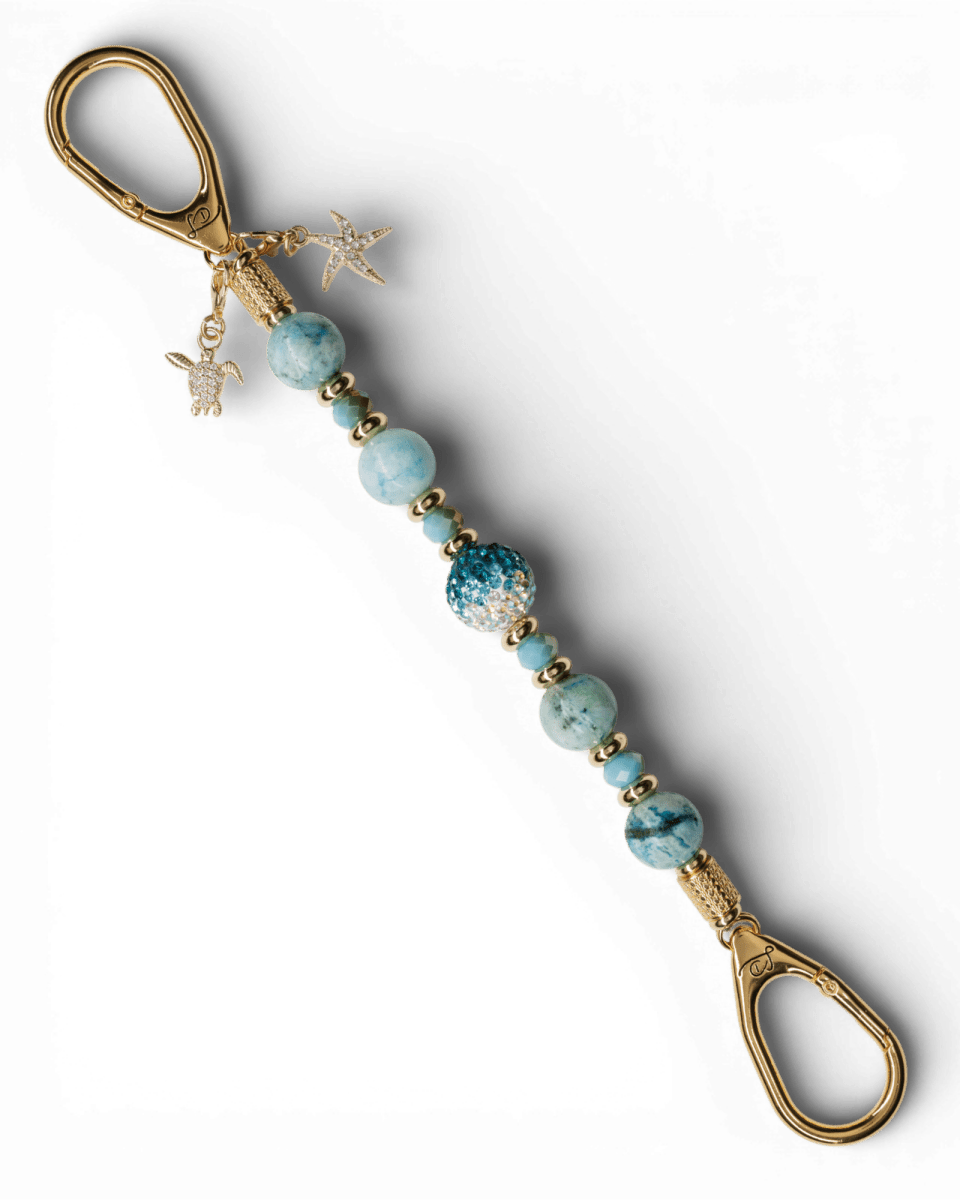 The look is elevated with 18KT gold-plated spacer beads and end beads, bringing warmth and refined elegance to the coastal palette. Completing the design are two enchanting charms: a gold-plated rhinestone starfish and a micro pavé 18KT gold-plated sea turtle, symbolizing guidance, protection, longevity, and the gentle wisdom of the sea.