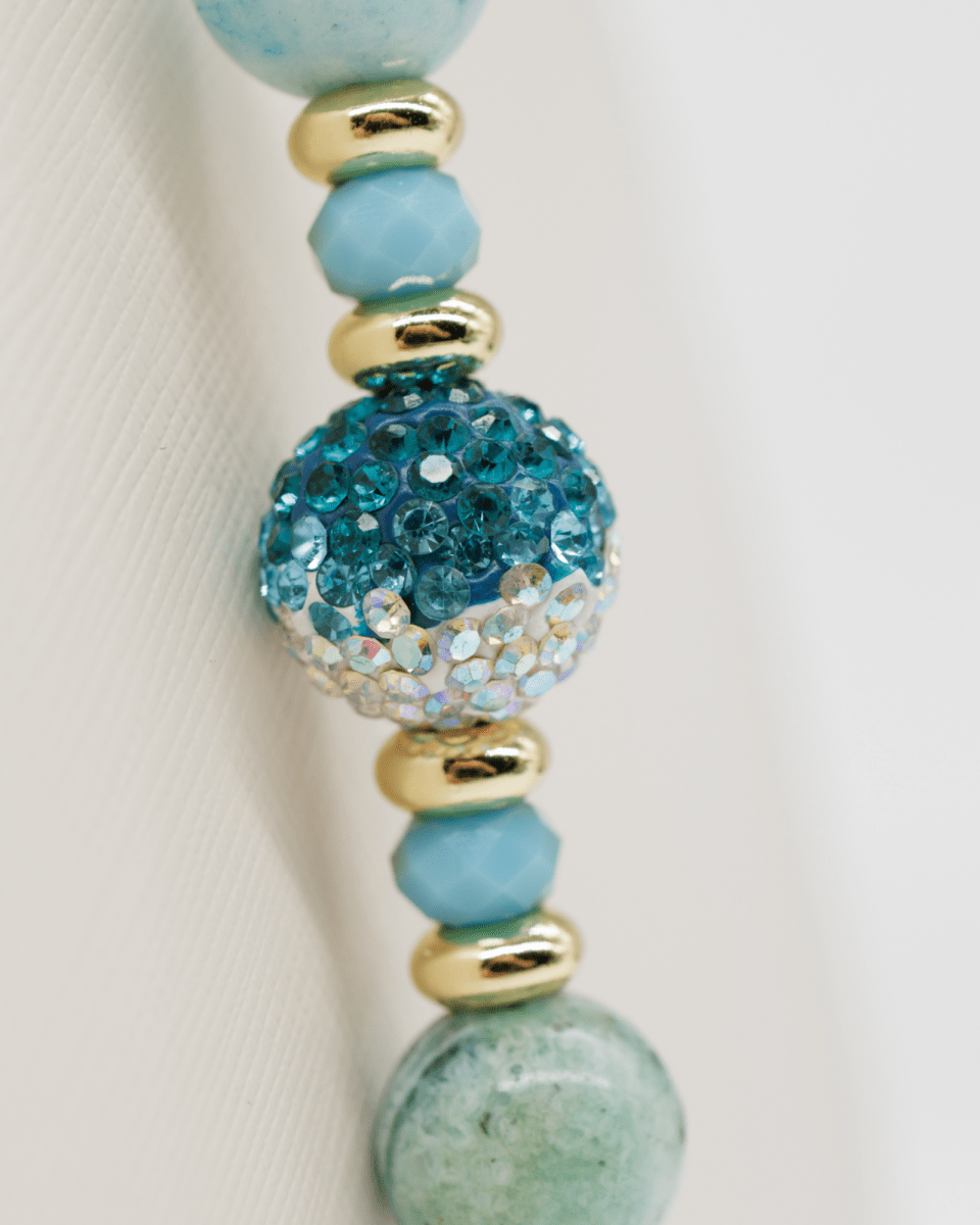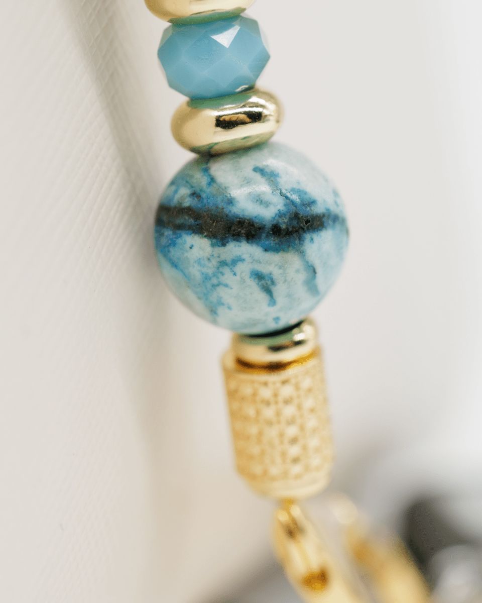 Golden Reef is crafted with genuine hemimorphite gemstone beads from South Africa, featuring soothing shades of aqua and soft teal inspired by tranquil ocean waters. Long associated with emotional balance, compassion, and heartfelt calm, hemimorphite is believed to encourage peaceful communication and inner clarity — making this design both visually captivating and deeply meaningful.