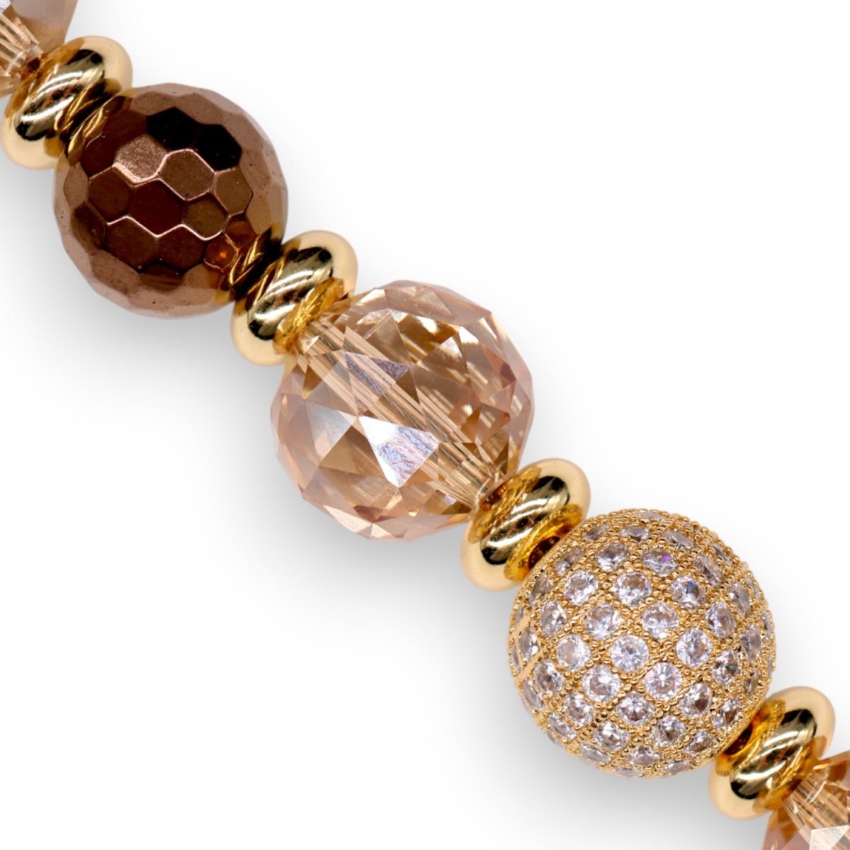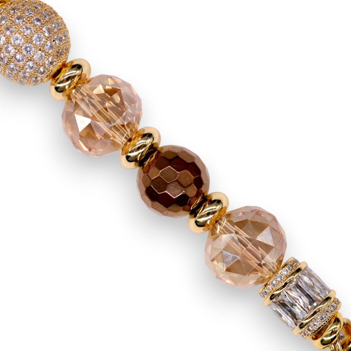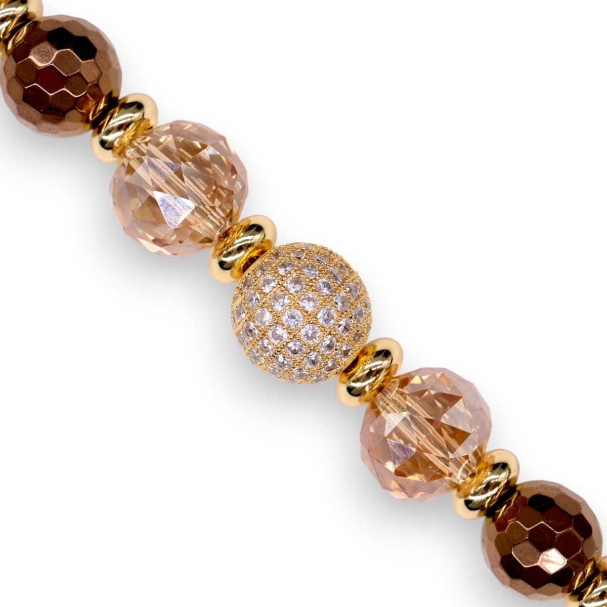 At its heart, an 18KT gold-plated micro pavé rhinestone center bead shimmers with radiant brilliance, beautifully complemented by a gold-plated micro pavé snowflake charm that captures the quiet wonder of winter’s first light. Surrounded by electroplated golden faceted crystal glass beads and rich copper-plated golden hematite gemstones—known for their grounding, balancing energy—this design sparkles with warmth, depth, and elegance.